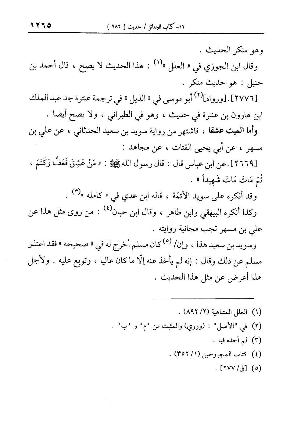 وأما الميت عشقا، فاشتهر من رواية سويد بن سعيد الحدثاني، عن علي بن مسهر، عن أبي يحيى القتات، عن مجاهد: