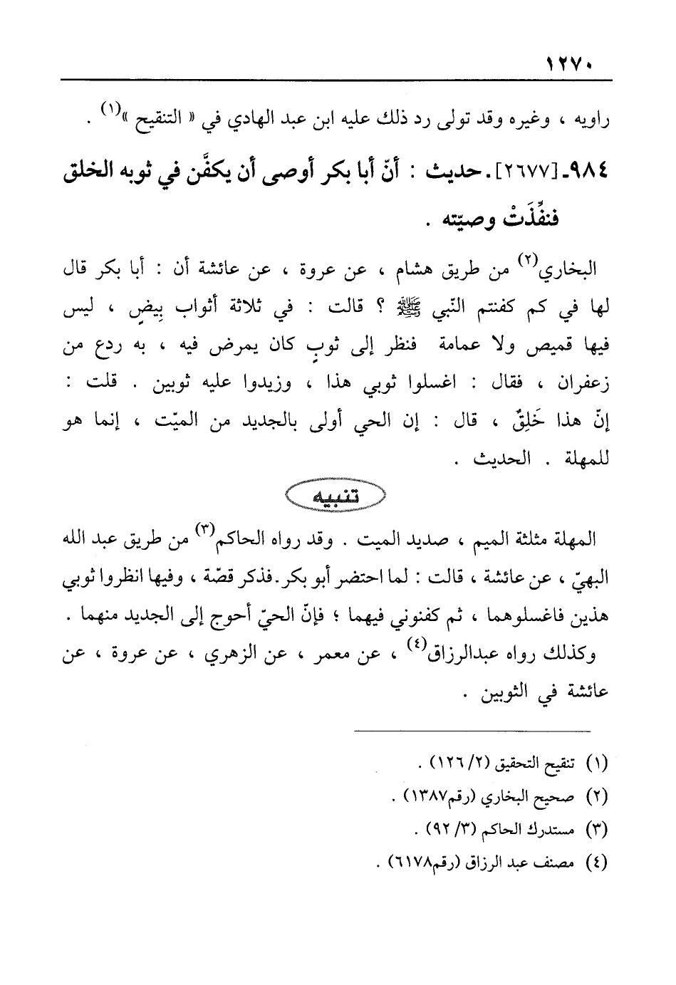 984 - [2677]- حديث: أنّ أبا بكر أوصى أن يكفَّن في ثوبه الخلق فنفِّذَتْ وصيّته.