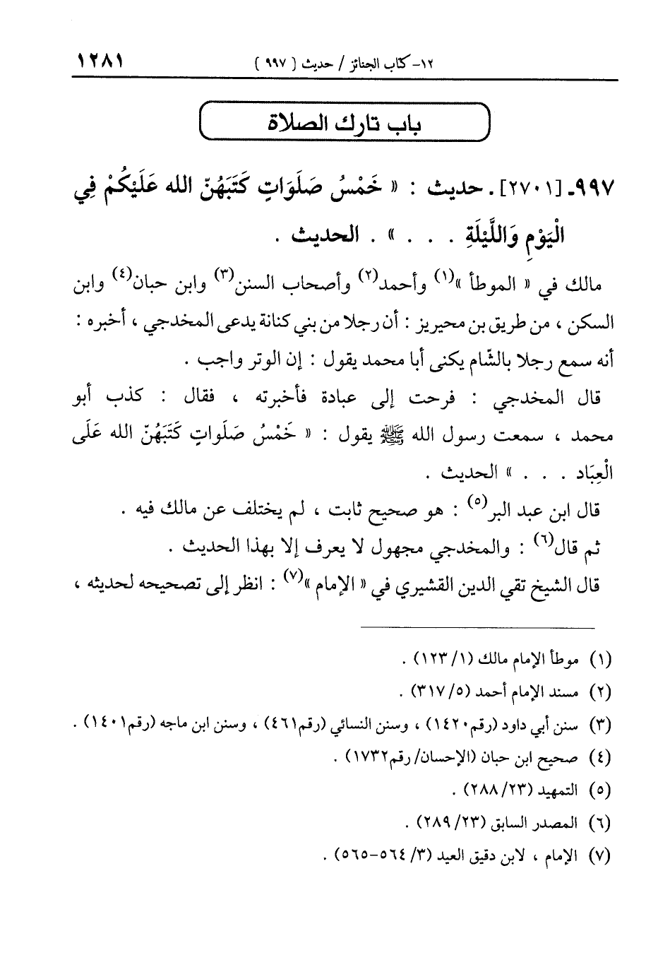 997 - [2701]- حديث: "خَمْسُ صَلّوَات كتَبَهُنّ الله عَلَيكُمْ في الْيَوْمِ وَاللَّيْلَةِ ... ". الحديث.