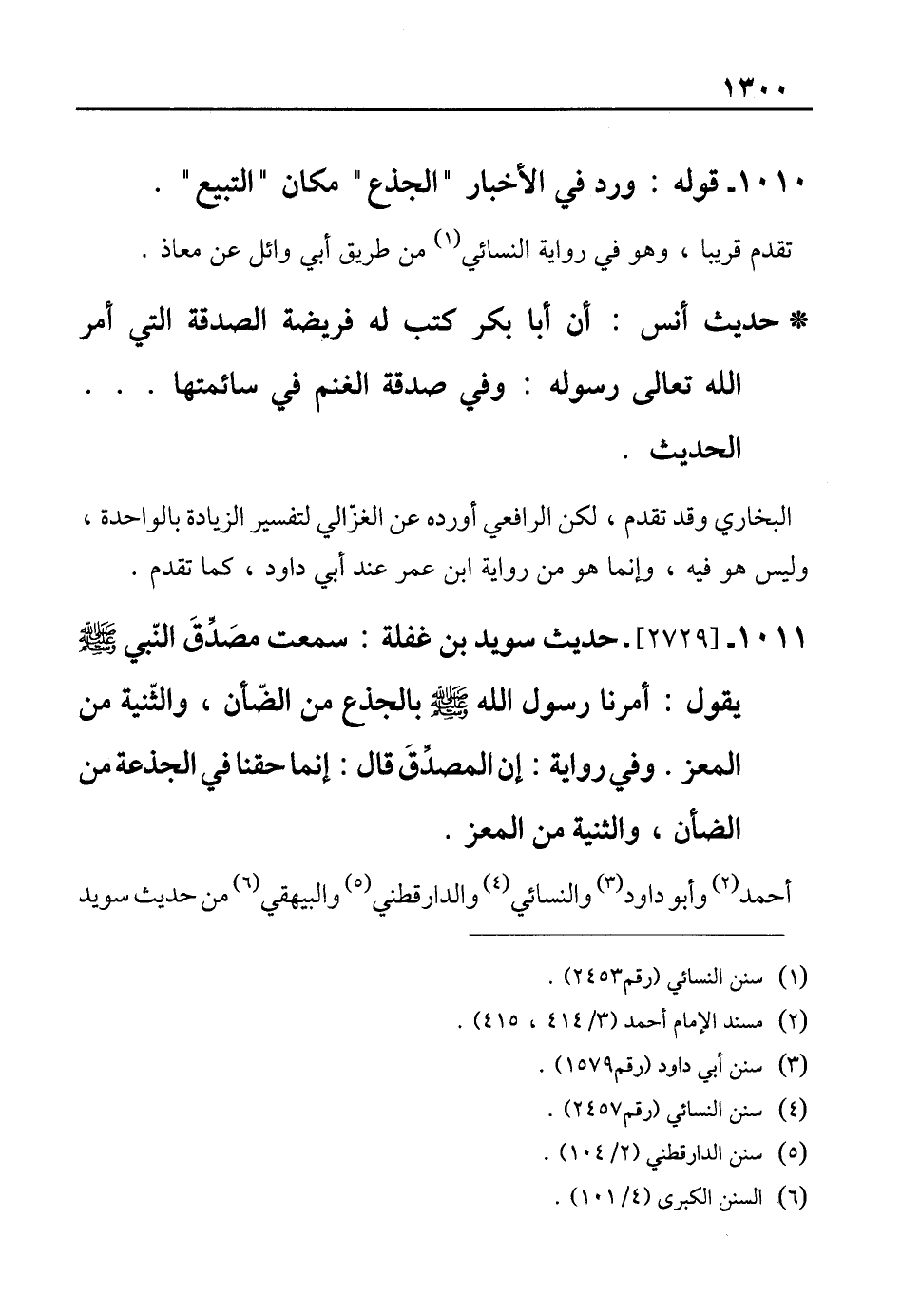 1011 - [2729]- حديث سويد بن غفلة: سمعت مصَدِّقَ النبي-صلى الله عليه وسلم- يقول: أمرنا رسول الله-صلى الله عليه وسلم- بالجذع من الضأن، والثّنية من المعز. وفي رواية: إن المصدِّقَ قال: إنما حقنا في الجذعة من الضأن، والثنية من المعز.