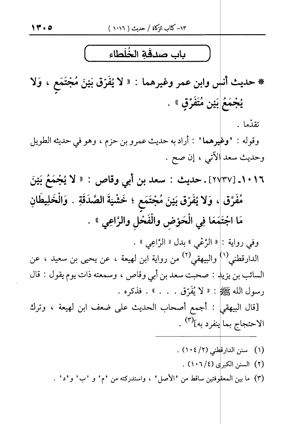 1016 - [2737]- حديث: سعد بن أبي وقاص: "لا يُجْمَعُ بَيْنَ مُفَرَّق، وَلا يُفَرّق بَينَ مُجْتَمَعٍ؛ خَشْيَةَ الصَّدَقَةِ. وَالْخَلِيطَانِ مَاجتمعا في الْحَوْضِ والْفَخلِ والرَّاعِي".
