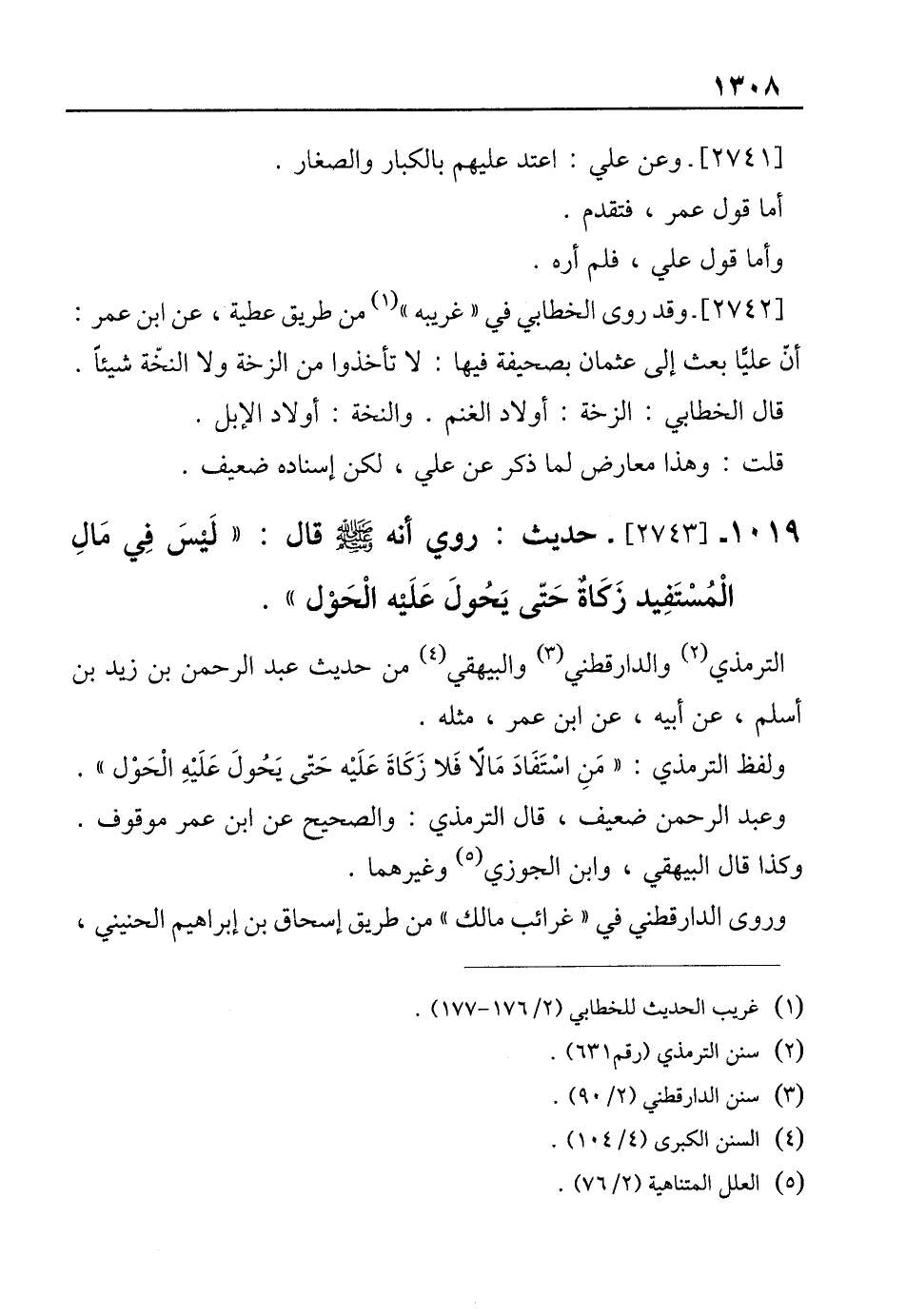 1019 - [2743]- حديث: روي أنه - صلى الله عليه وسلم - قال: "لَيسَ في مَالِ الْمُسْتَفِيد زَكَاةٌ حَتّى يَحُولَ عَلَيه الْحَوْل".