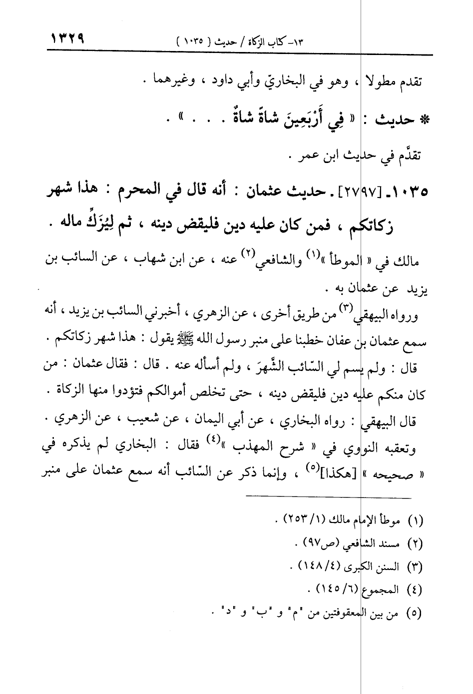 قال: ولم يسم لي السّائب الشَّهرَ، ولم أسأله عنه. قال؛ فقال عثمان: من دين فليقض دينه، حتى تخلص أموالكم فتؤدوا منها الزكاة.