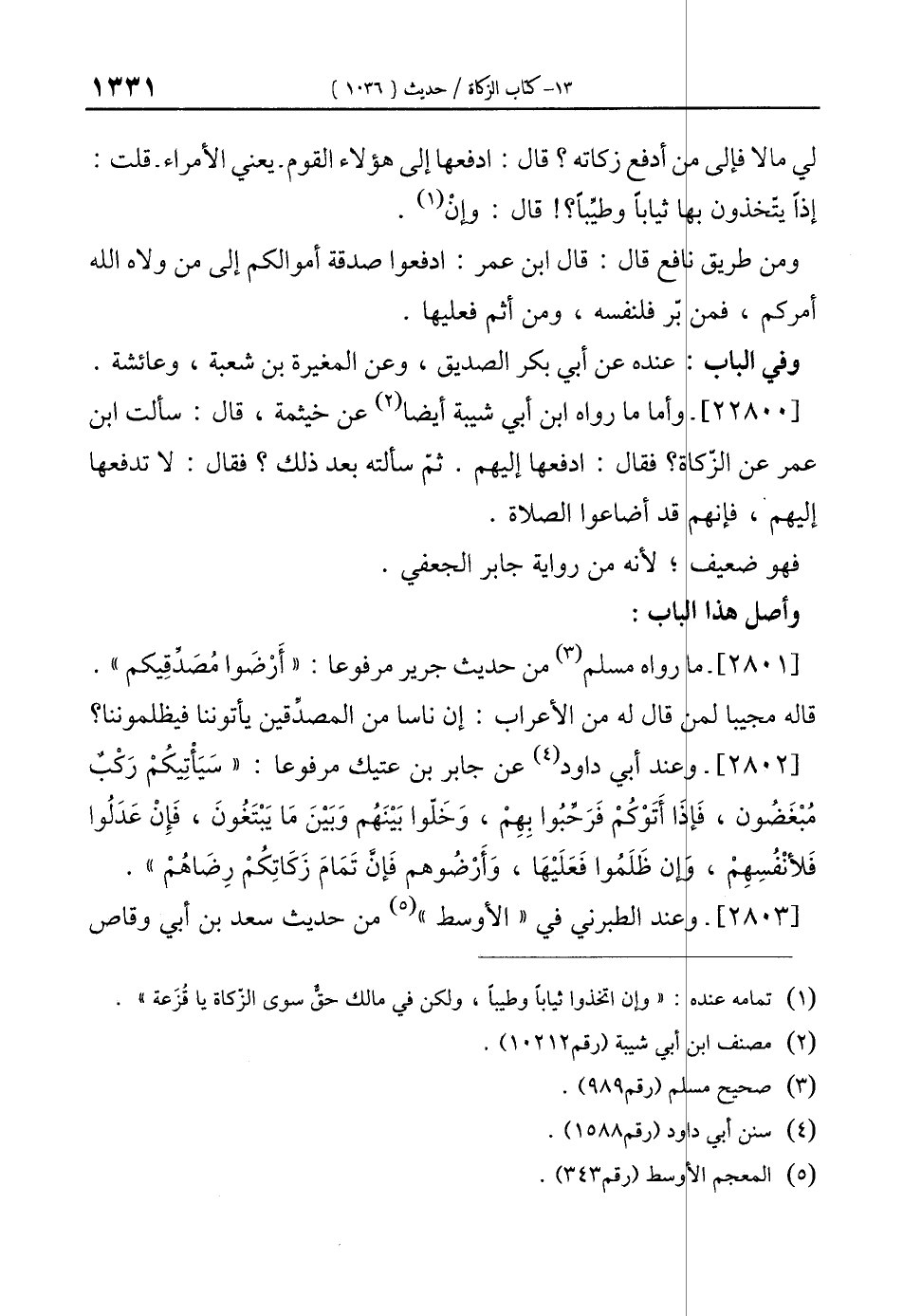 ومن طريقّ نافع قال: قال ابن عمر: ادفعوا صدقة أموالكم إلى من ولاه الله أمركم، فمن بر فلنفسه، ومن أثم فعليها.