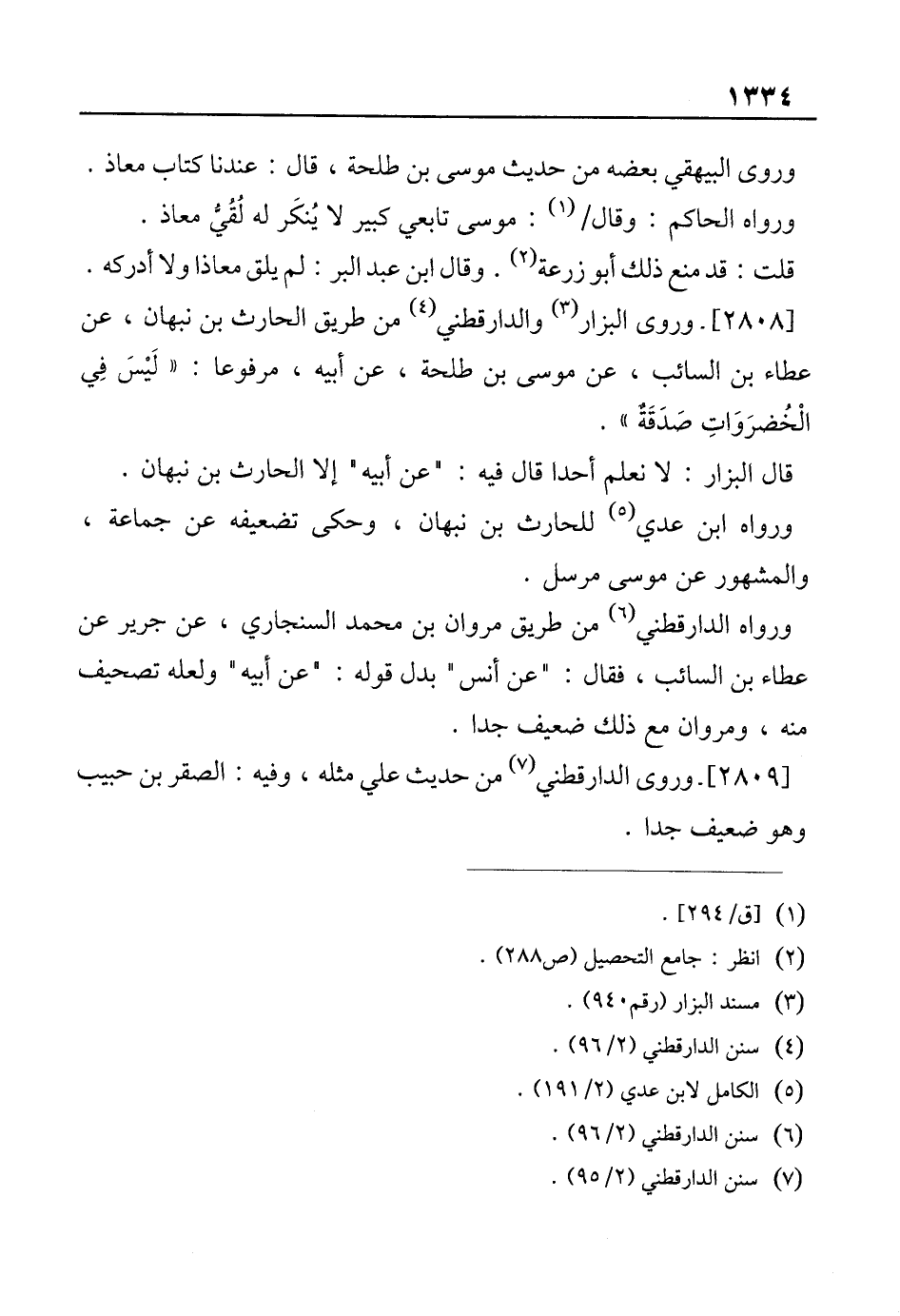 [2808]- وروى البزار (¬3) والدارقطني (¬4) من طريق الحارث بن نبهان، عن عطاء بن السائب، عن موسى بن طلحة، عن أبيه، مرفوعا: "لَيْسَ في الْخُضرَوَاتِ صَدَقَةٌ".