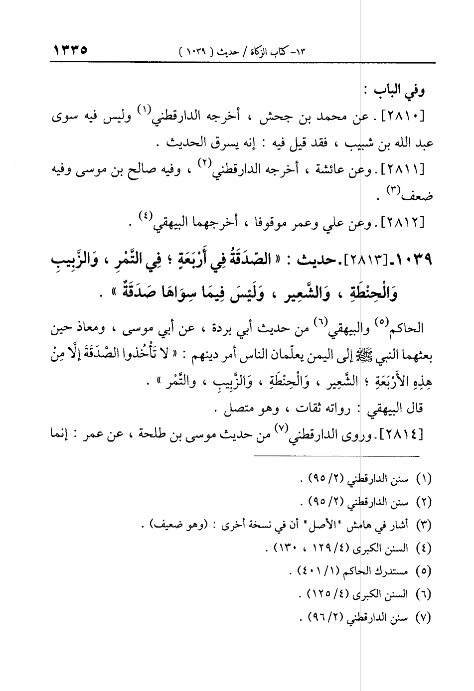 1039 - [2813]- حديث: "الصّدَقَةُ في أَرْبَعَةٍ؛ في التَّمْرِ، وَالزَّبِيبِ وَالْحِنْطةِ، وَالشَّعِير، وَلَيْسَ فِيمَا سِوَاهَا صَدَقَةٌ".