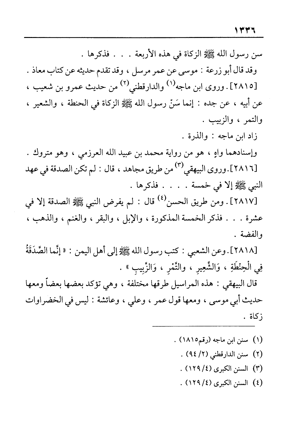 سن رسول الله-صلى الله عليه وسلم- الزكاة في هذه الأربعة ... فذكرها.