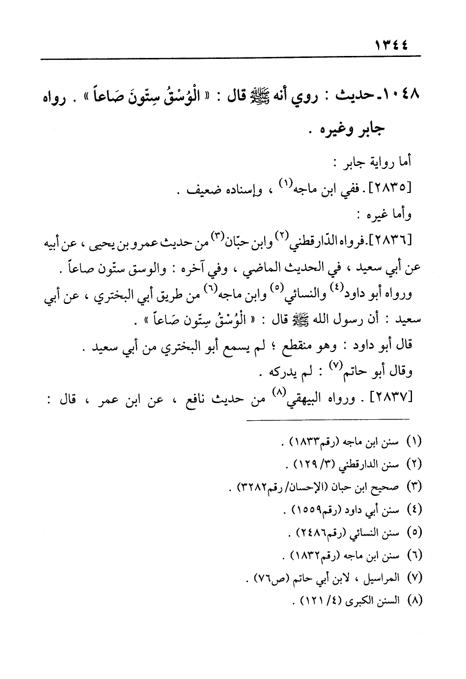 1048 - حديث: روي أنه في - صلى الله عليه وسلم - قال: "الْوُسْقُ سِتّونَ صَاعًا". رواه جابر وغيره.