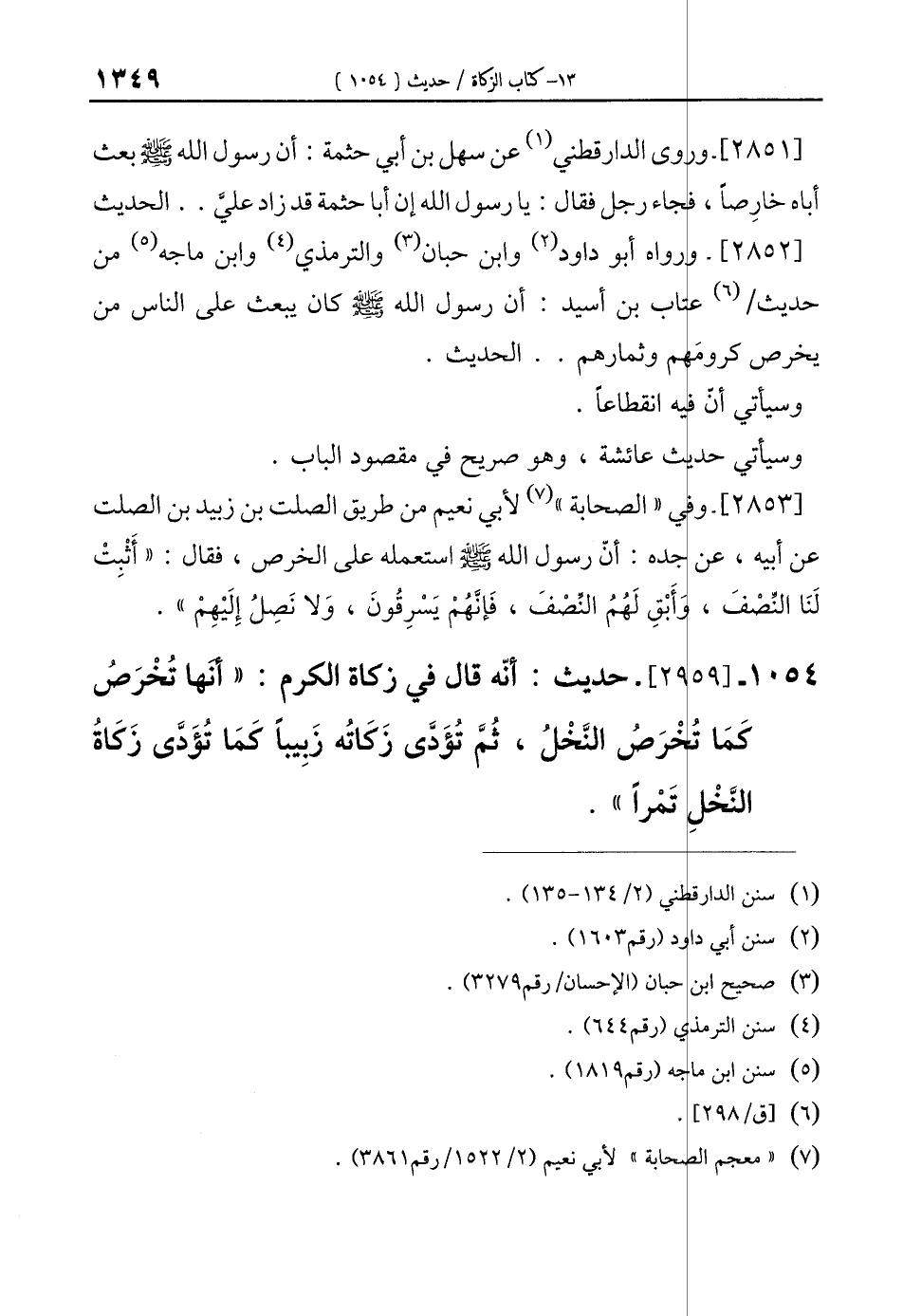 [2851]- وروى الدارقطني (¬1) عن سهل بن أبي حثمة: أن رسول الله-صلى الله عليه وسلم- بعث أباه خارِصًا , رجل فقال: يا رسول الله إن أبا حثمة قد زاد عليَّ .. الحديث