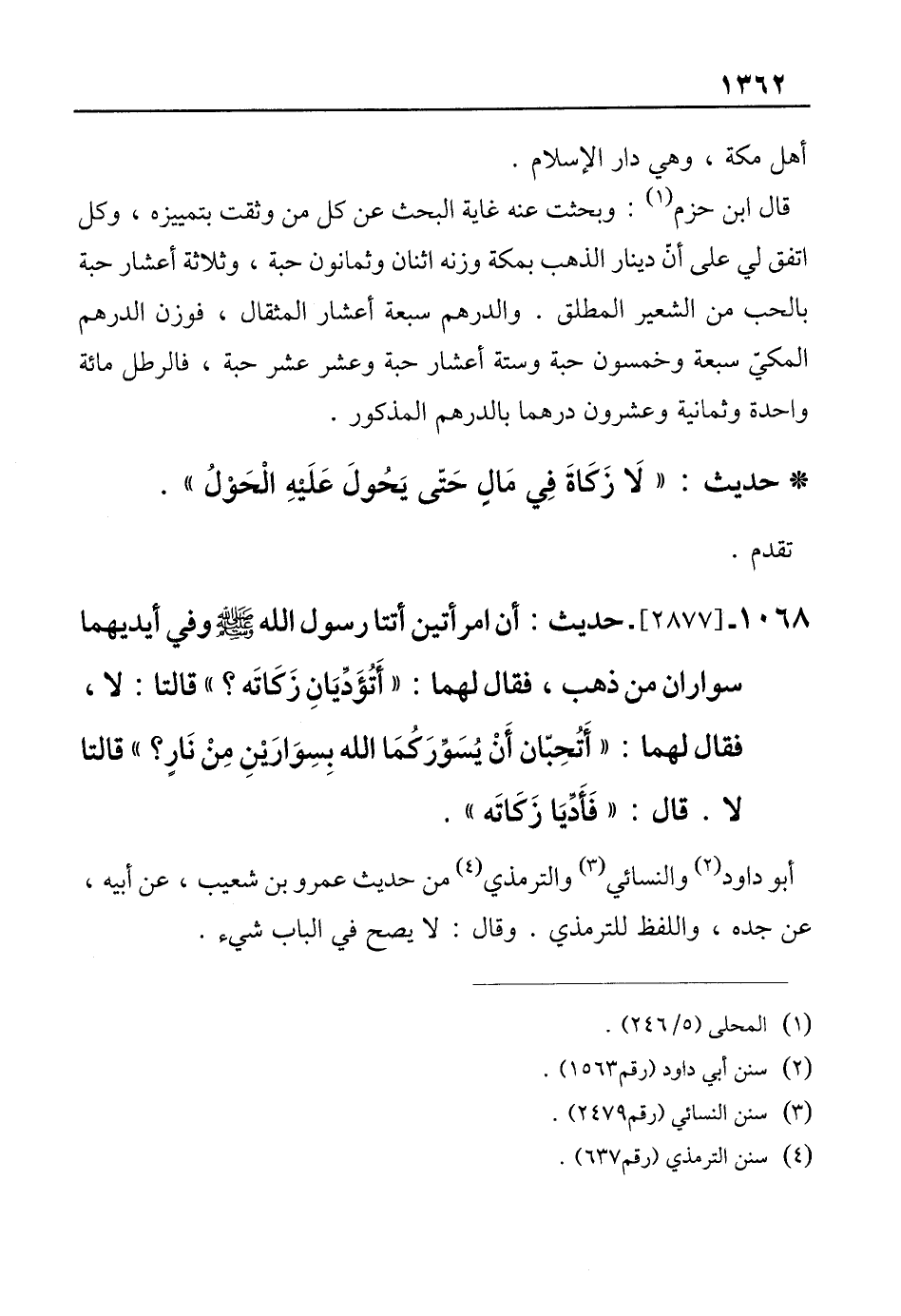 1068 - [2877]- حديث: أن امرأتين أتتا رسول الله-صلى الله عليه وسلم- وفي أيديهما سواران من ذهب، فقال لهما: "أَتُؤَذيَانِ زَكاتَه؟ " قالتا: لا، فقال لهما: "أَتُحِبّان أَنْ يُسَوِّرَكُمَا الله بِسِوَارَيْنِ مِنْ نَارٍ؟ " قالتا لا. قال: "فَأَدْيَا زَكاتَه".
