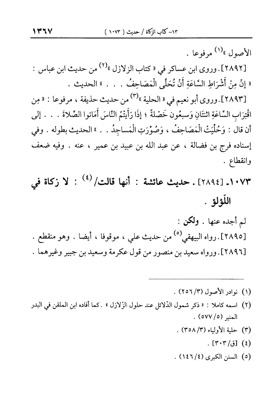 1073 - [2894]- حديث عائشة: أنها قالت/ (¬4): لا زكاة في اللّؤلؤ.