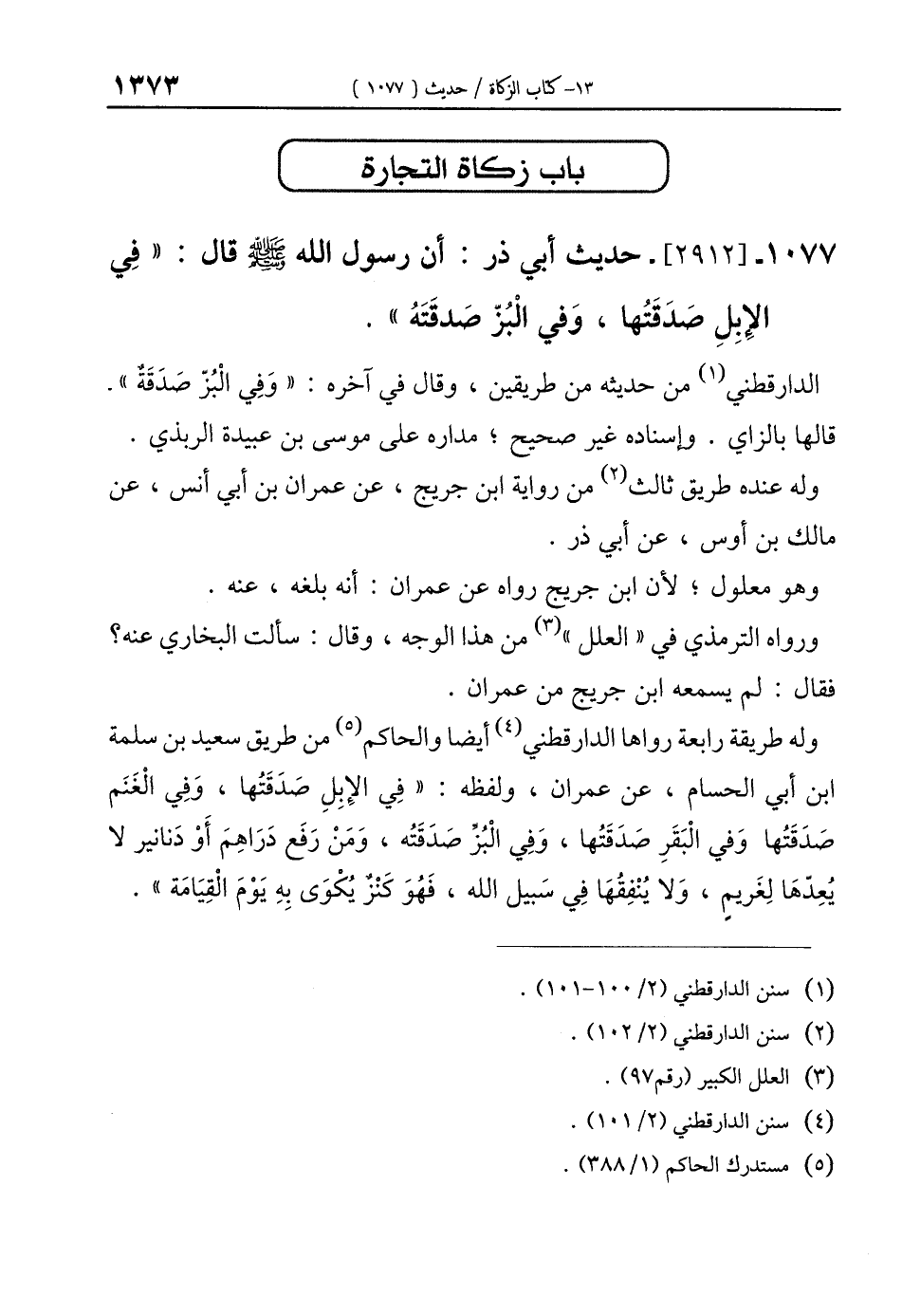 1077 - [2912]- حديث أبي ذر: أن رسول الله-صلى الله عليه وسلم- قال: "في الإِبِلِ صَدَقَتُها، وَفي الْبُزّ صَدقَتَهُ".