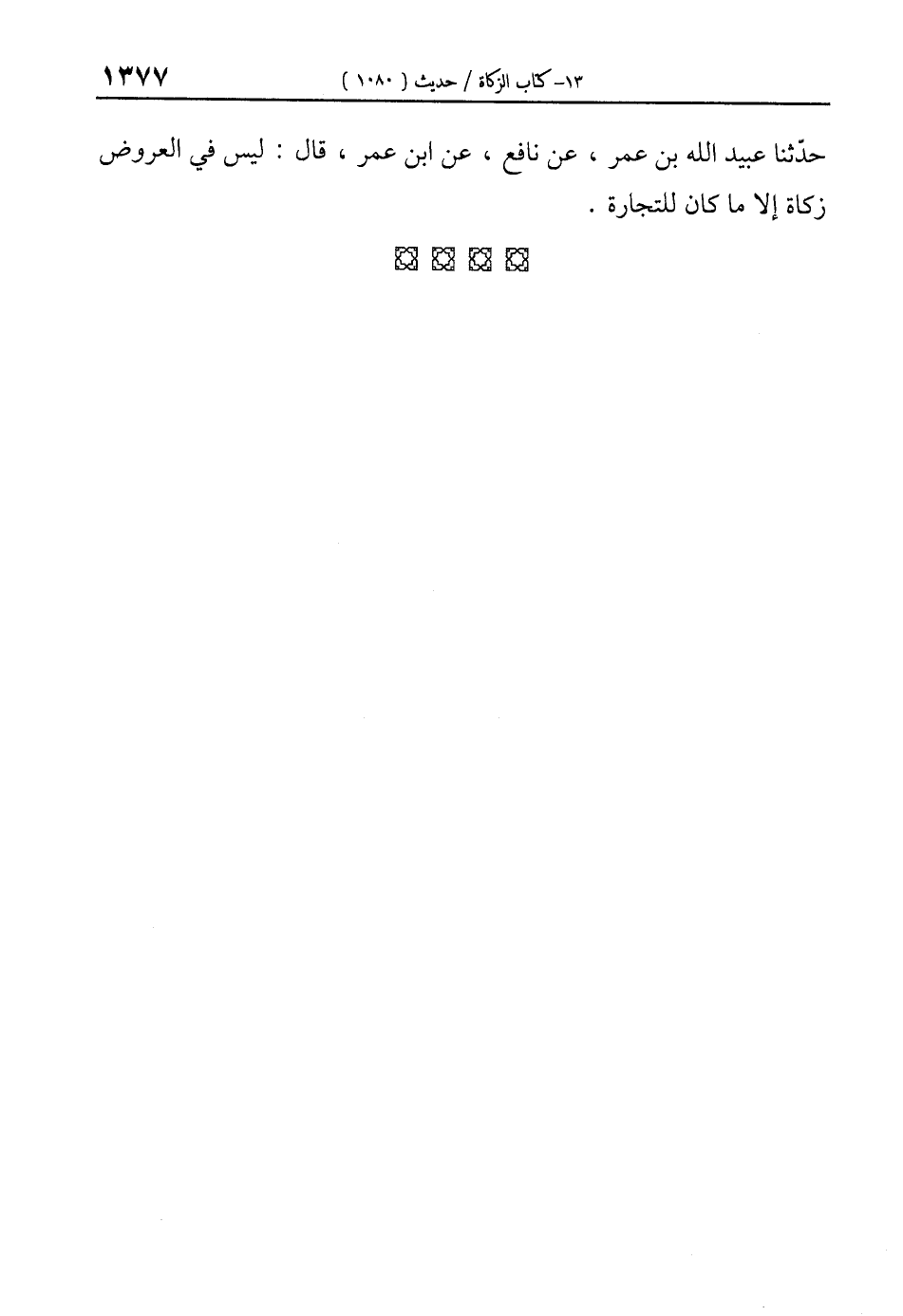 حدّثنا عبيد الله بن عمر، عن نافع، عن ابن عمر، قال: ليس في العروض زكاة إلا ما كان للتجارة.