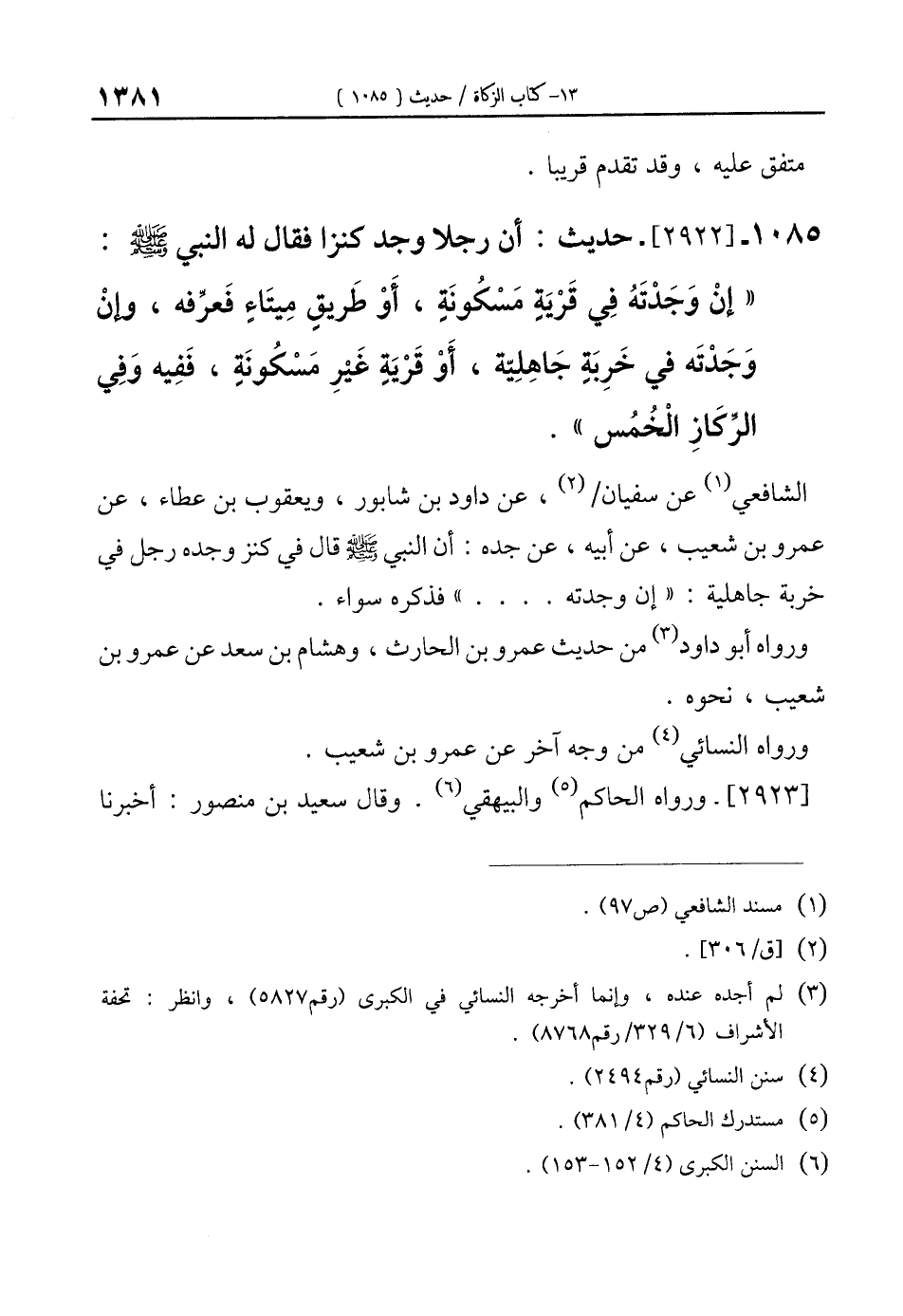 1085 - [2922]-حديث: أن رجلا وجد كنزا فقال له النبي-صلى الله عليه وسلم: "إنْ وَجَدْتَهُ في قَرْيَةٍ مَسْكُونَةٍ، أَوْ طَريقٍ مِيتَاء فَعرِّفه، وإنْ وَجَدْتَه في خَرِبَةٍ جَاهِلِيّة، أَوْ قَرْيَةٍ غَيْرِ مَسْكُونَةٍ، فَفِيه وَفِي الرِّكازِ الْخُمُس".