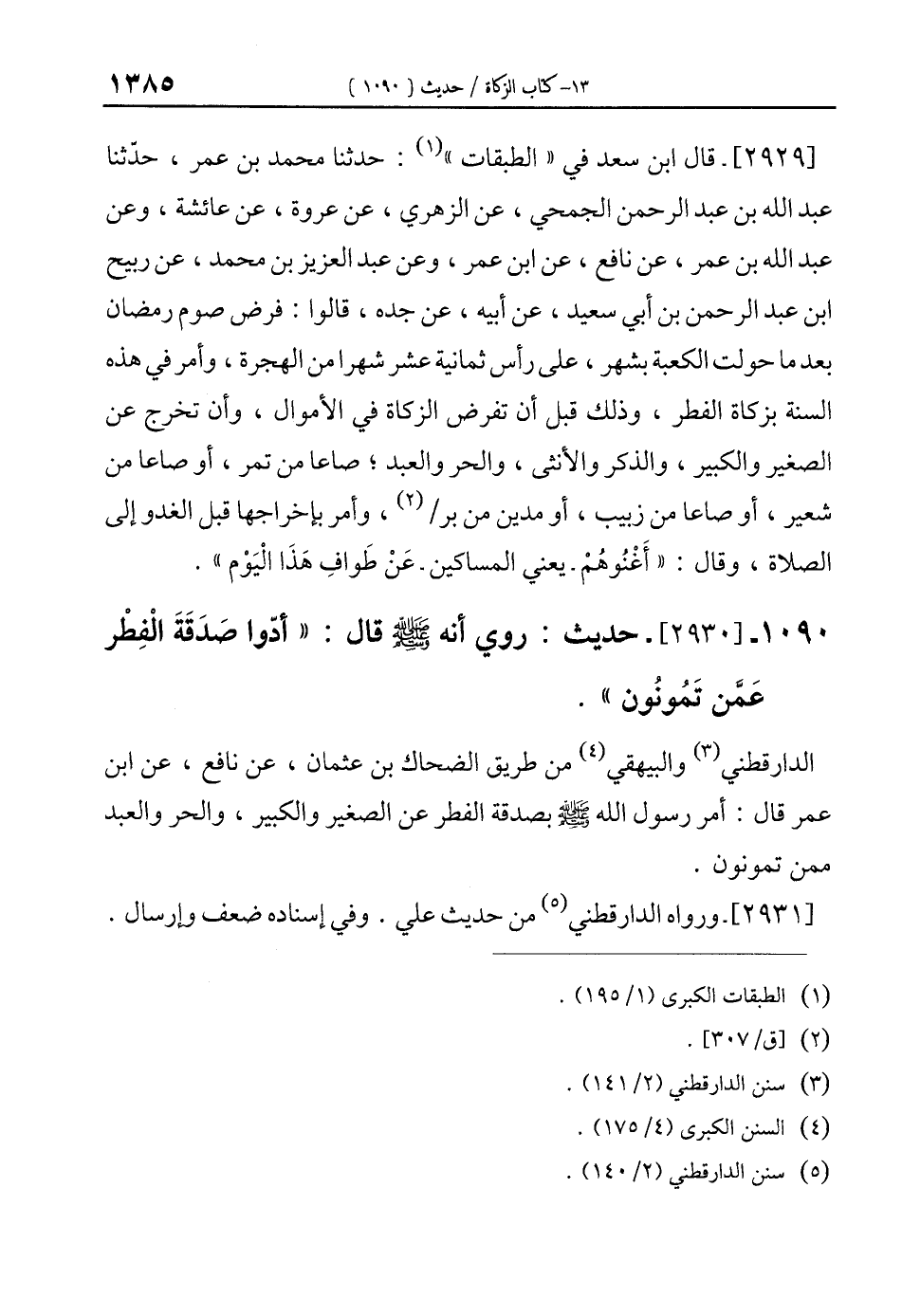 [2929]- قال ابن سعد في "الطبقات" (¬1): حدثنا محمَّد بن عمر، حدّثنا عبد الله بن عبد الرحمن الجمحي، عن الزهري، عن عروة، عن عائشة، وعن عبد الله بن عمر، عن نافع، عن ابن عمر، وعن عبد العزيز بن محمد، عن ربيح ابن عبد الرحمن بن أبي سعيد، عن أبيه، عن جده، قالوا: فرض صوم رمضان بعد ما حولت الكعبة بشهر، على رأس ثمانية عشر شهرا من الهجرة، وأمر في هذه السنة بزكاة الفطر، وذلك قبل أن تفرض الزكاة في الأموال، وأن تخرج عن الصغير والكبير، والذكر والأنثى، والحر والعبد؛ صاعا من تمر، أو صاعا من شعير، أو صاعا من زبيب، أو مدين من بر/ (¬2)، وأمر بإخراجها قبل الغدو إلى الصلاة، وقال: " أَغْنُوهُمْ -يعني المساكين- عَنْ طَوافِ هَذَا الْيَوْم".