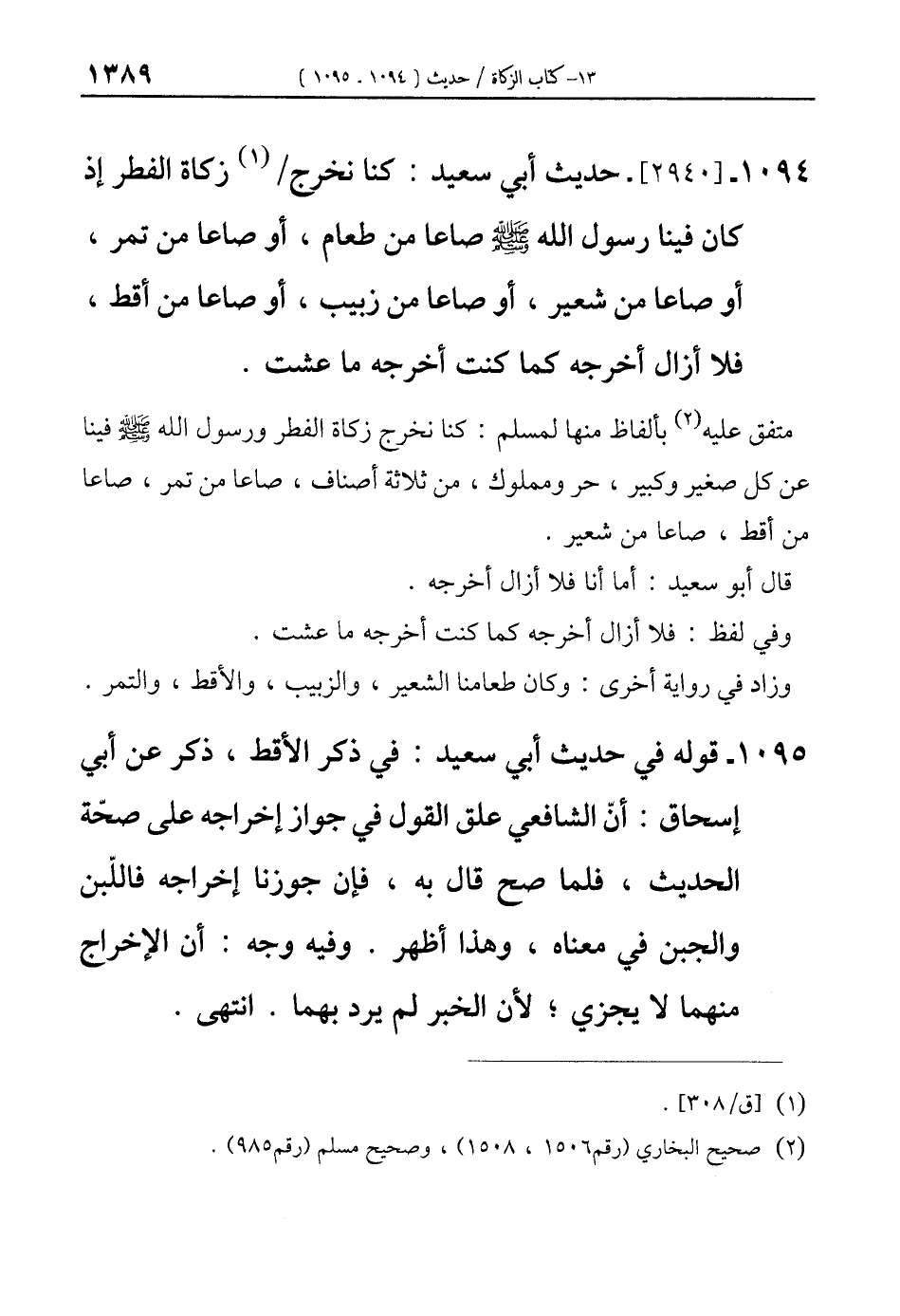 1094 - [2940]- حديث أبي سعيد: كنا نخرج/ (¬1) زكاة الفطر إذ كان فينا رسول الله-صلى الله عليه وسلم- في صاعا من طعام، أو صاعا من تمر، أو صاعا من شعير، أو صاعا من زبيب، أو صاعا من أقط، فلا أزال أخرجه كما كنت أخرجه ما عشت.