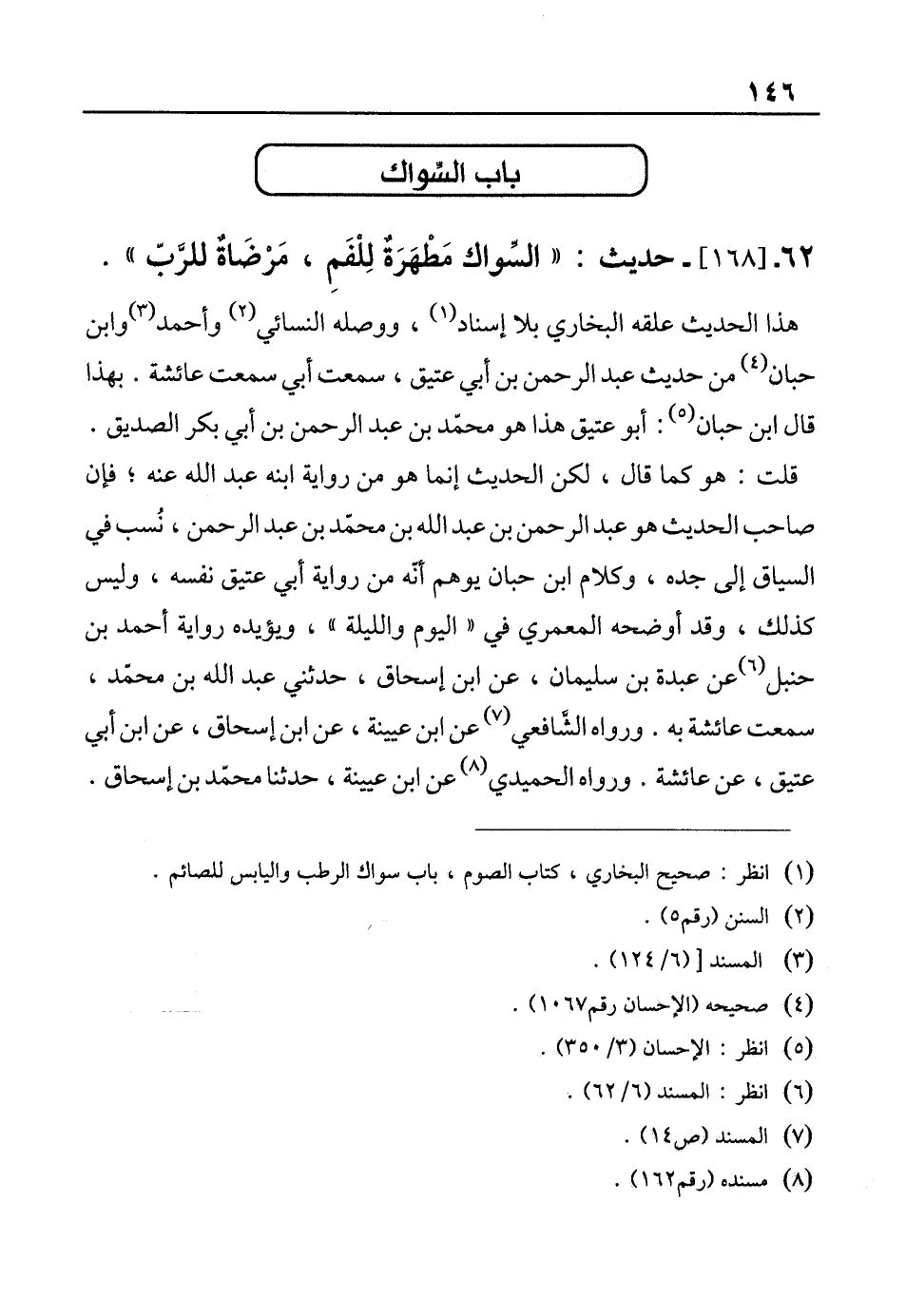 62 - [168]- حديث: "السِّواك مَطْهَرَةٌ لِلْفَمِ، مَرْضَاةٌ للرَّبِّ".