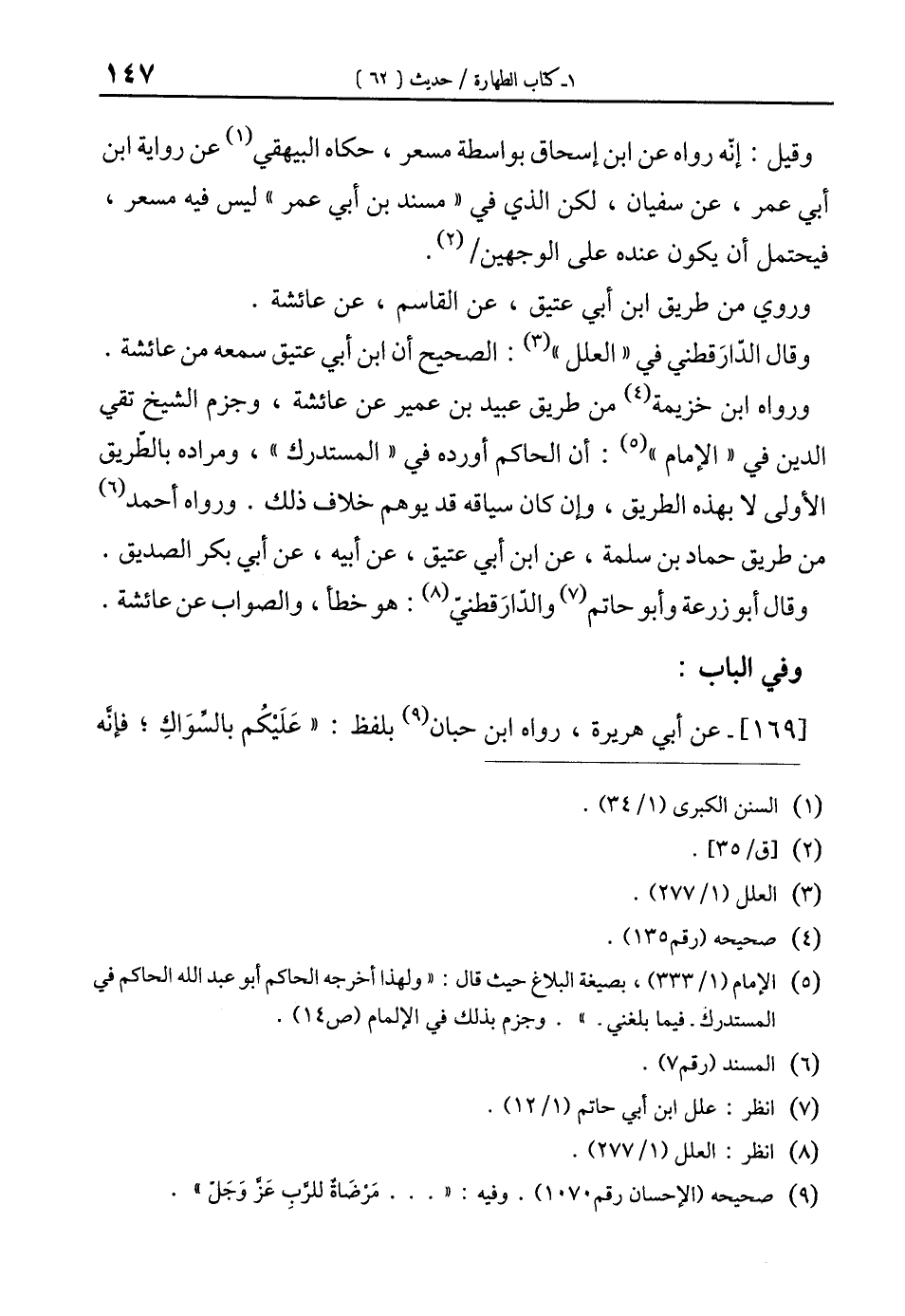 [169]- عن أبي هريرة، رواه ابن حبان (¬9) بلفظ: " عَلَيْكُم بالسِّوَاكِ؛ فإنَّه