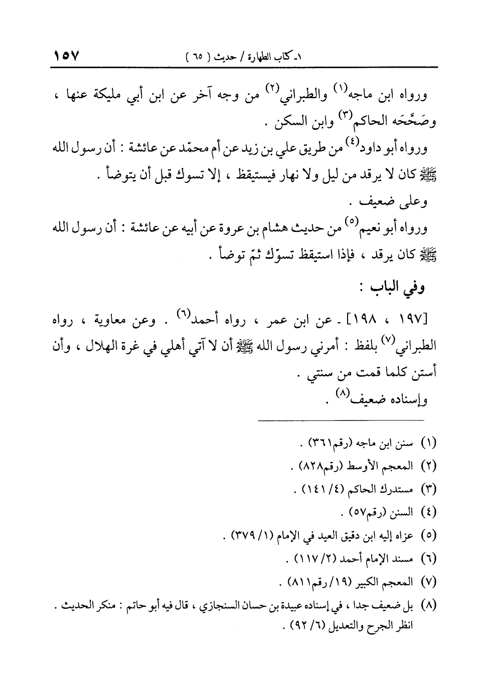 [197، 198]- عن ابن عمر، رواه أحمد (¬6). وعن معاوية، رواه الطبراني (¬7) بلفظ: أمرني رسول الله - صلى الله عليه وسلم - أن لا آتي أهلي في غرة الهلال، وأن أستن كلما قمت من سنتي.