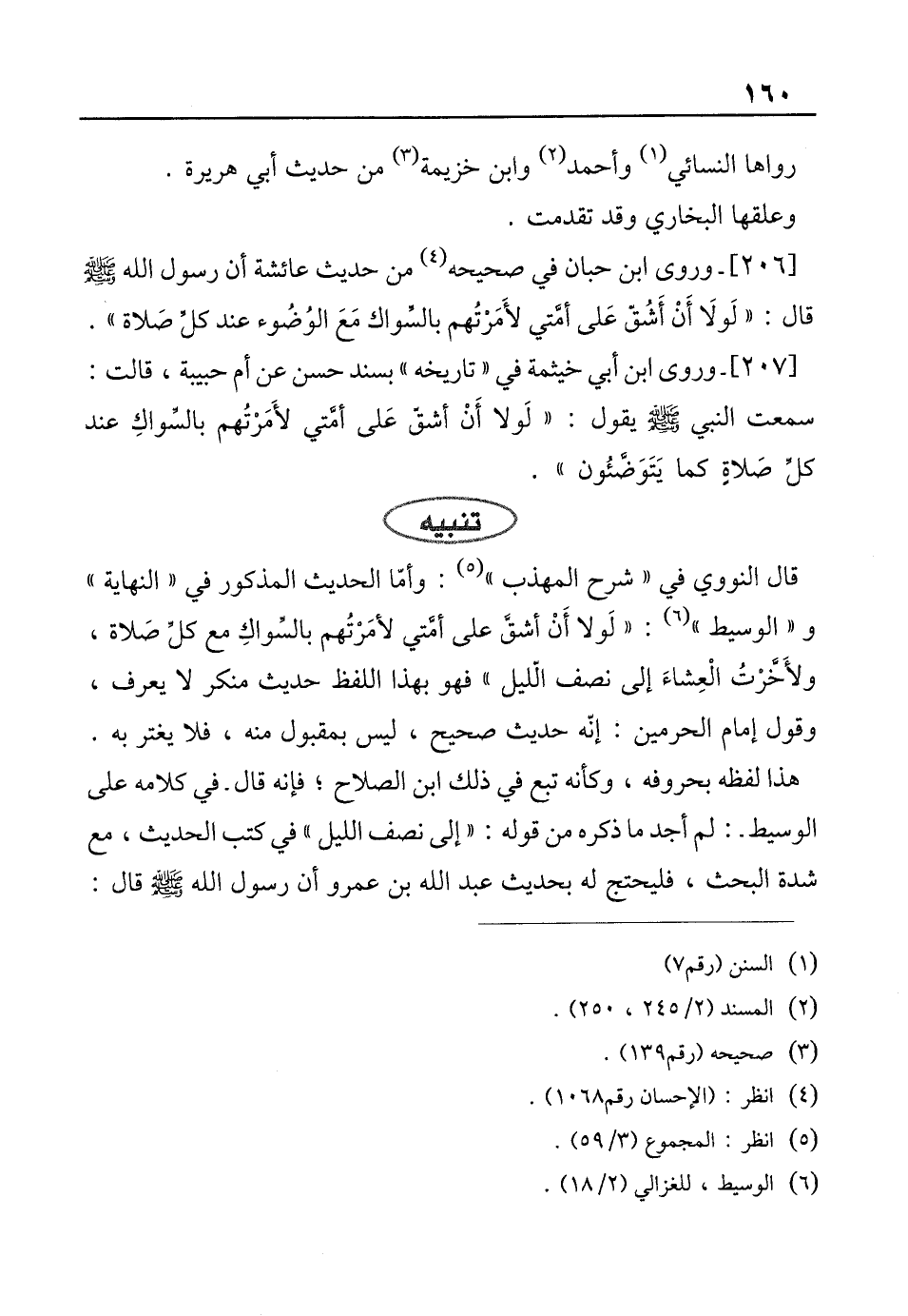 [207]- وروى ابن أبي خيثمة في "تاريخه" بسند حسن عن أم حبيبة، قالت: سمعت النبي - صلى الله عليه وسلم - يقول: "لَولا أَنْ أشق عَلى أمَّتي لأَمَرْتُهم بالسِّواكِ عند كلّ صَلاةٍ كما يَتَوَضَّئُون".