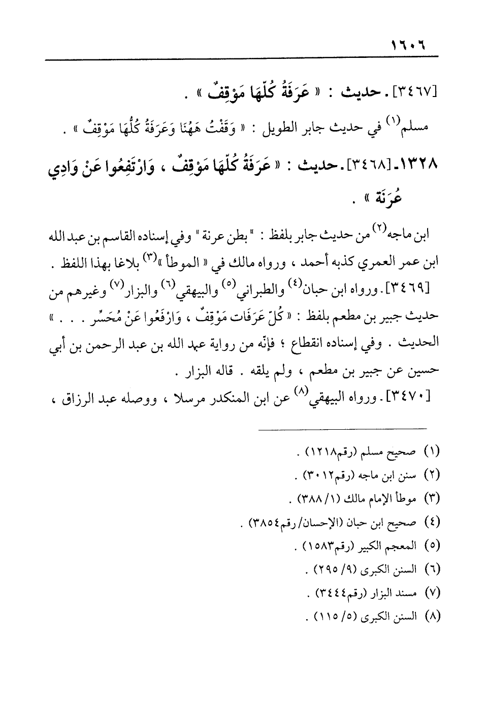 1328 - [3468]- حديث: "عَرَفَةُ كُلّهَا مَوْقِفٌ، وَارْتَفِعُوا عَنْ وَادِي عُرَنَة".