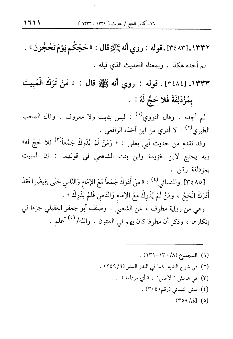 [3485]- وللنسائي (¬4): "مَنْ أَدْرَكَ جَمْعًا مَعَ الإمَامِ وَالنَّاسِ حَتَّى يَفِيضُوا فَقَدْ أَدْرَكَ الْحَجَّ، وَمَنْ لَمْ يُدْرِكْ مَعَ الإمَامِ وَالنَّاسِ فَلَمْ يُدْرِكْ".