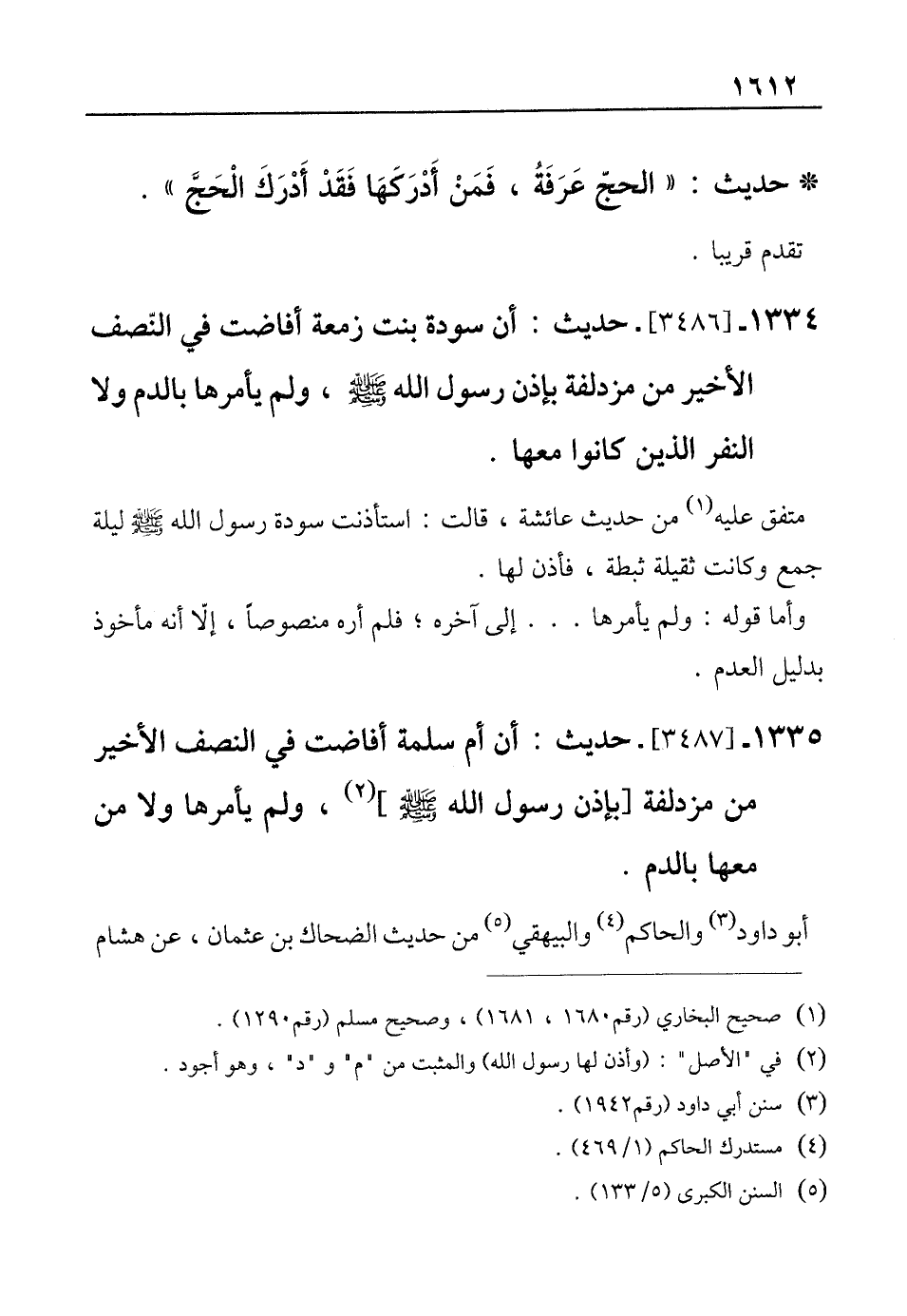 1334 - [3486]- حديث: أن سودة بنت زمعة أفاضت في النّصف الأخير من مزدلفة بإذن رسول الله - صلى الله عليه وسلم -، ولم يأمرها بالدم ولا النفر الذين كانوا معها.