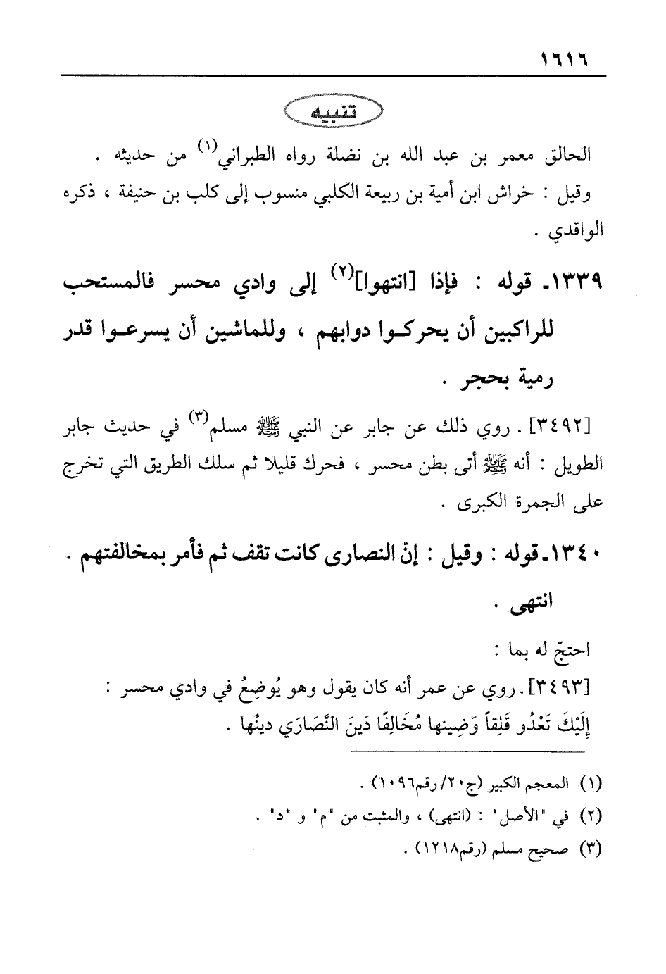 1339 - قوله: فإذا [انتهوا] (¬2) إلى وادي محسر فالمستحب للراكبين أن يحركوا دوابهم، وللماشين أن يسرعوا قدر رمية بحجر.