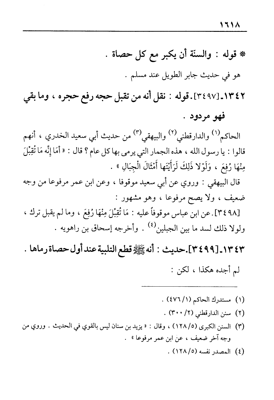 1343 - [3499]- حديث: أنه صلى الله عليه وسلم قطع التلبية عند أول حصاة رماها.