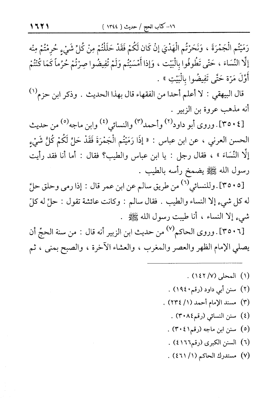 [3504]- وروى أبو داود (¬2) وأحمد (¬3) والنسائي (¬4) وابن ماجه (¬5) من حديث الحسن العرني، عن ابن عباس: "إذا رَمَيْتُم الْجَمْرَةَ فَقَدْ حَلَّ لَكُمْ كُلُّ شَيءٍ إلَّا النِّسَاءَ"، فقال رجل: يا ابن عباس والطيب؟ فقال: أما أنا فقد رأيت رسول الله - صلى الله عليه وسلم - يضمخ رأسه بالطيب.