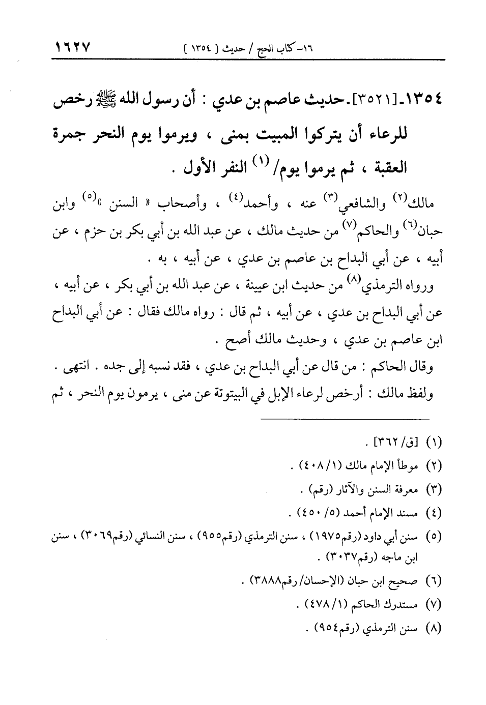 1354 - [3521]- حديث عاصم بن عدي: أن رسول الله - صلى الله عليه وسلم - رخص للرعاء أن يتركوا المبيت بمنى، ويرموا يوم النحر جمرة العقبة، ثم يرموا يوم (¬1) النفر الأول.