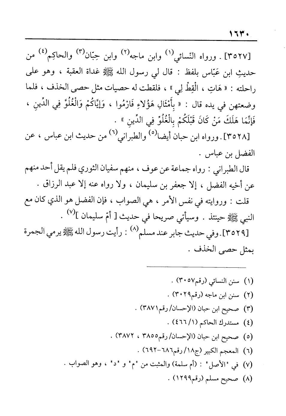 [3527]- ورواه النسائي (¬1) وابن ماجه (¬2) وابن حِبّان (¬3) والحاكِم (¬4) من حديثِ ابن عَبّاس بلفظ: قال لي رسول الله - صلى الله عليه وسلم - غداة العقبة، وهو على راحلته: "هَاتِ، الْقِطْ لِي"، فلقطت له حصيات مثل حصى الخذف، فلما وضعتهن في يده قال: "بِأَمْثَالِ هَؤُلاءِ فَارْمُوا، وَإيَّاكُمْ وَالْغُلُوَّ في الدِّينِ، فَإنَّمَا هَلَكَ مَنْ كَانَ قَبْلَكُمْ بِالْغُلُوِّ في الدِّينِ".