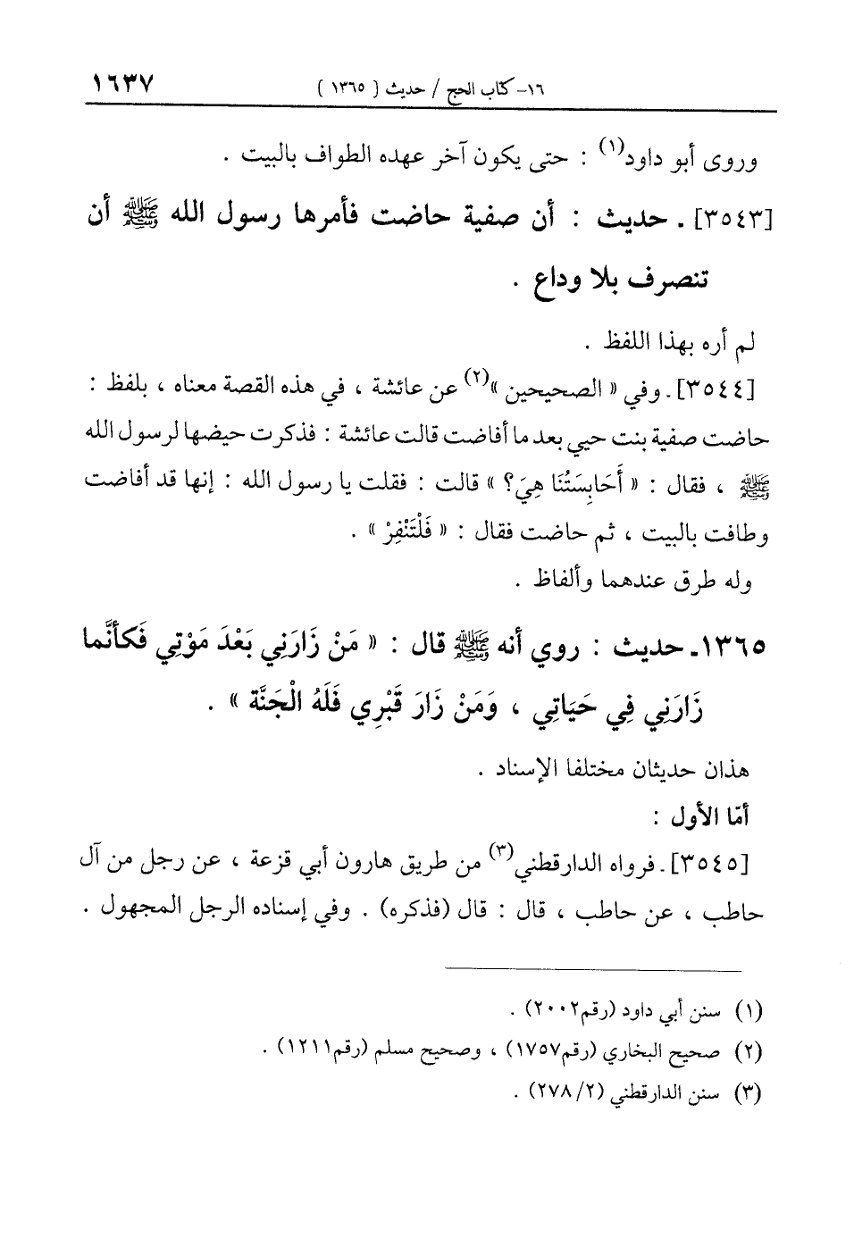 [3543]- حديث: أن صفية حاضت فأمرها رسول الله - صلى الله عليه وسلم - أن تنصرف بلا وداع.