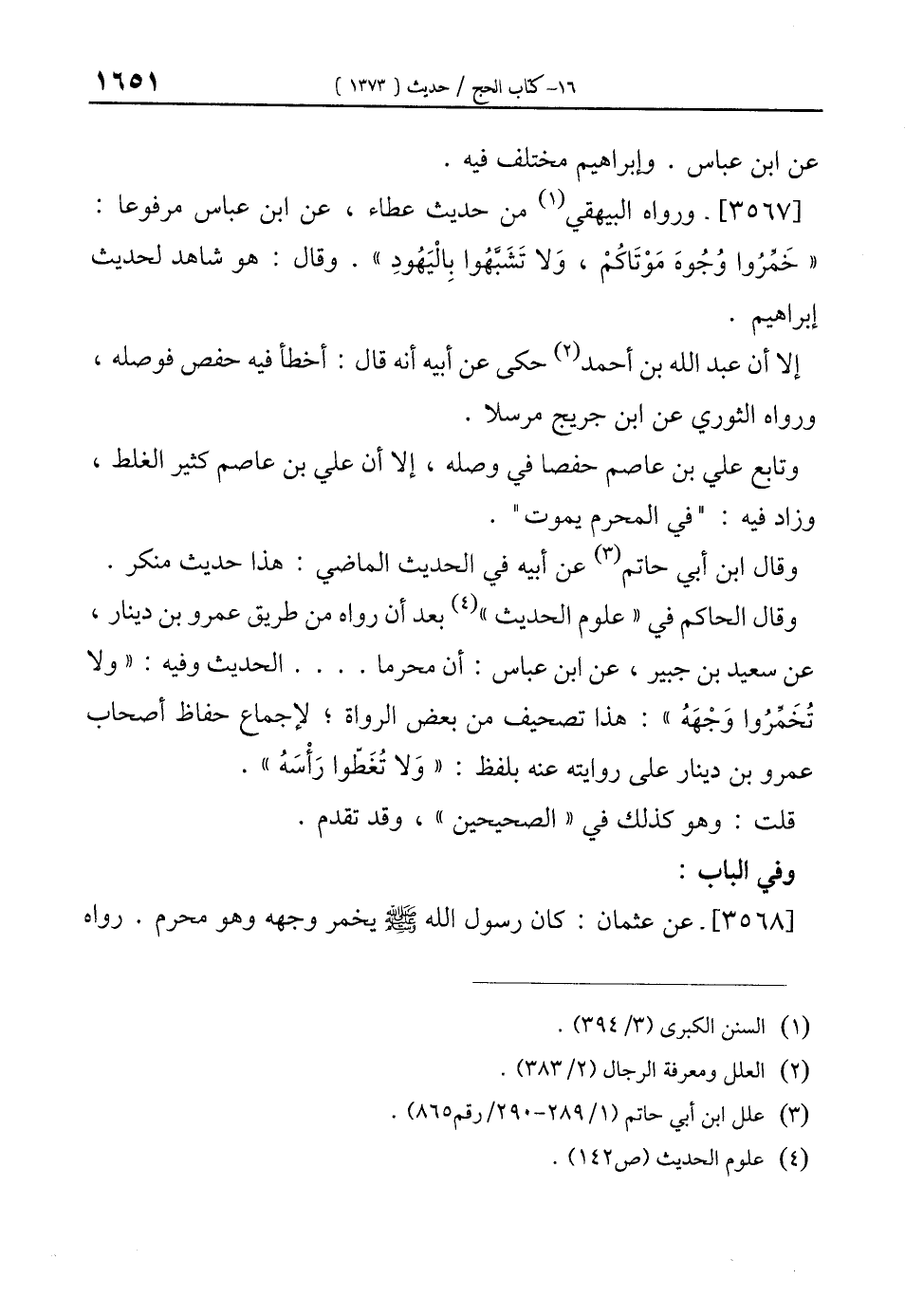 [3567]- ورواه البيهقي (¬1) من حديث عطاء، عن ابن عباس مرفوعًا: "خَمِّرُوا وُجُوهَ مَوْتَاكُمْ، وَلا تَشَبَّهُوا بِالْيَهُودِ". وقال: هو شاهد لحديث إبراهيم.