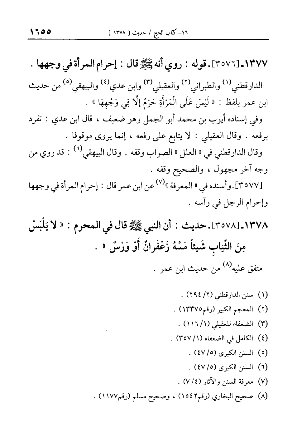 الدارقطني (¬1) والطبراني (¬2) والعقيلي (¬3) وابن عدي (¬4) والبيهقي (¬5) من حديث ابن عمر بلفظ: "لَيْسَ عَلَى الْمَرْأَةِ حَرَمٌ إلَّا في وَجْهِهَا".