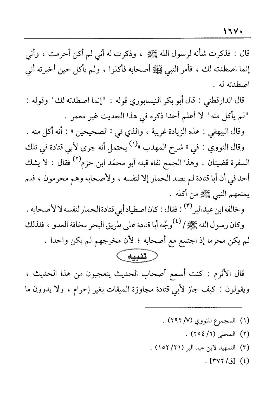 قال الأثرم: كنت أسمع أصحاب الحديث يتعجبون من هذا الحديث، ويقولون: كيف جاز لأبي قتادة مجاوزة الميقات بغير إحرام، ولا يدرون ما