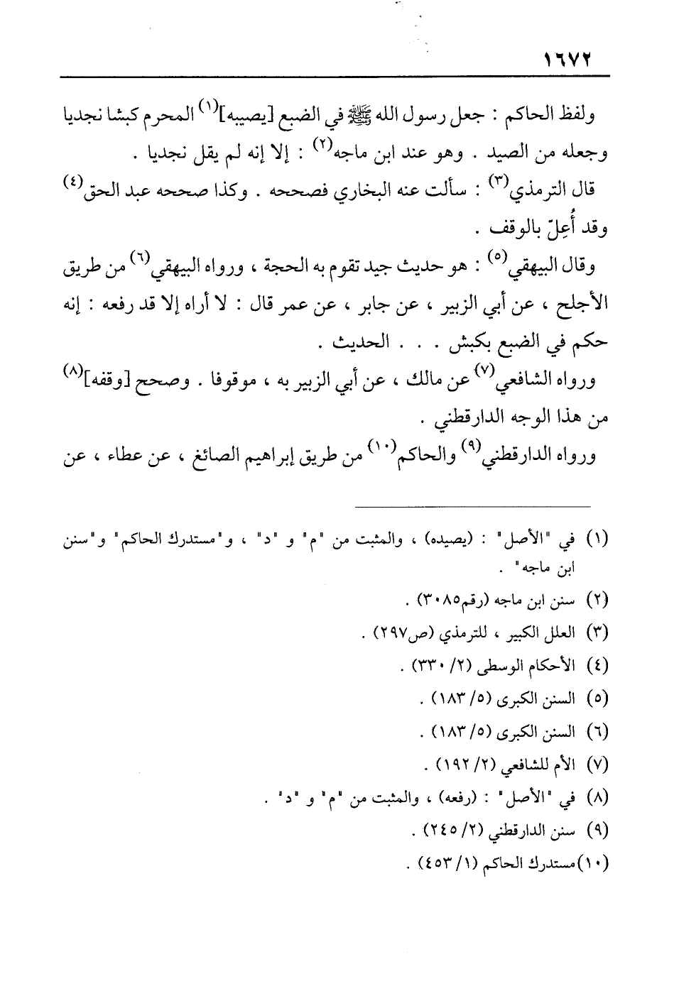 ولفظ الحاكم: جعل رسول الله صلى الله عليه وسلم في الضبع [يصيبه] (¬1) المحرم كبشا نجديا وجعله من الصيد. وهو عند ابن ماجه (¬2): إلا إنه لم يقل نجديا.