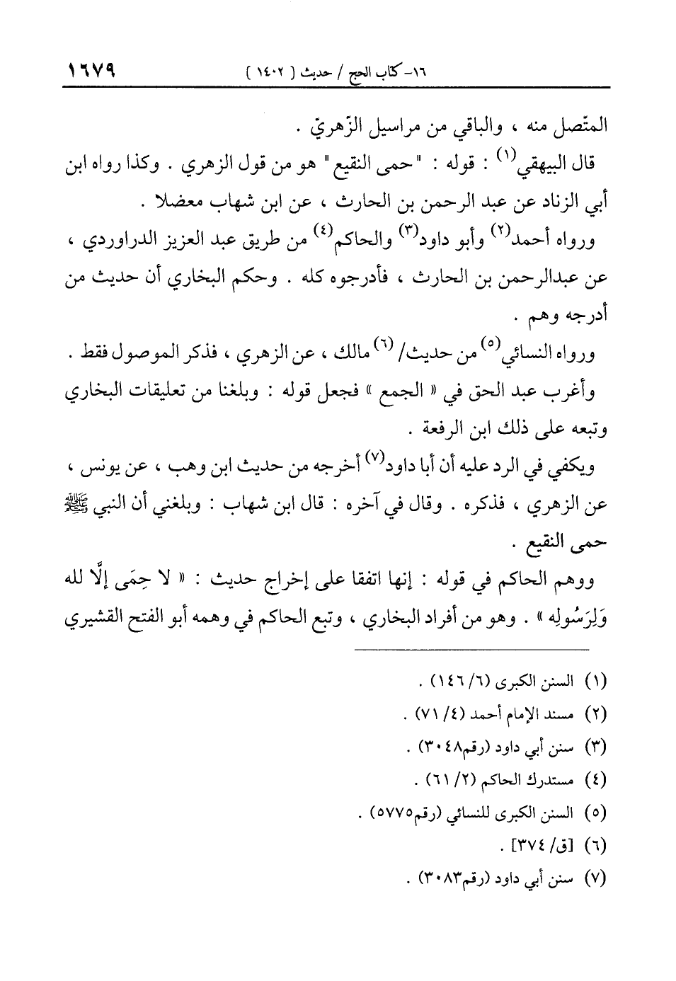 قال البيهقي (¬1): قوله: "حمى النقيع" هو من قول الزهري، وكذا رواه ابن أبي الزناد عن عبد الرحمن بن الحارث، عن ابن شهاب معضلا.