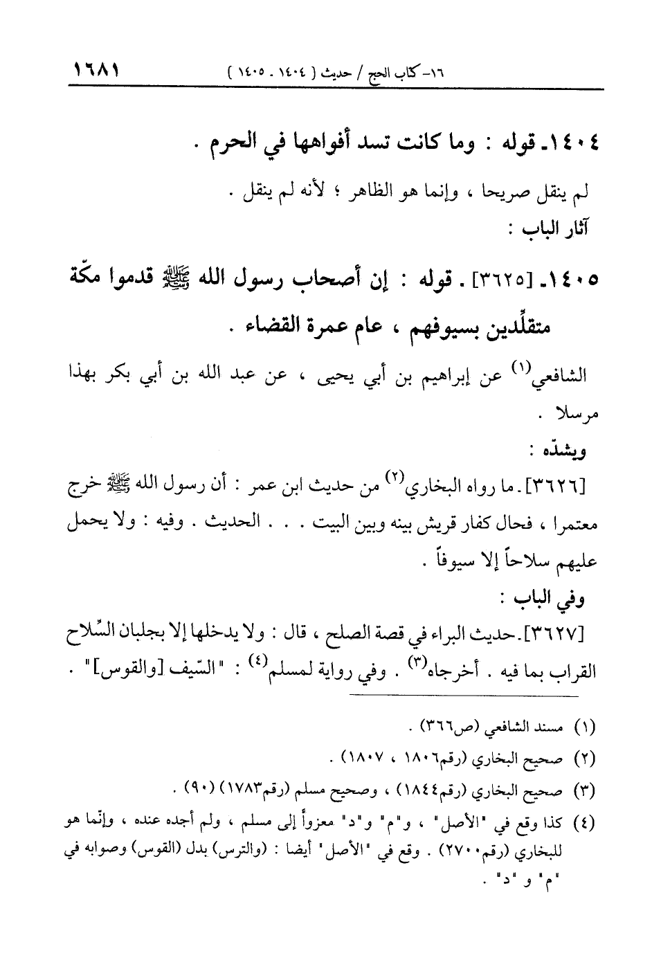 1405 - [3625]- قوله: إن أصحاب رسول الله صلى الله عليه وسلم قدموا مكّة متقلِّدين بسيوفهم، عام عمرة القضاء.