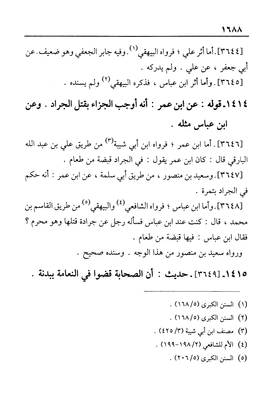 1414 - قوله: عن ابن عمر: أنه أوجب الجزاء بقتل الجراد. وعن ابن عباس مثله.