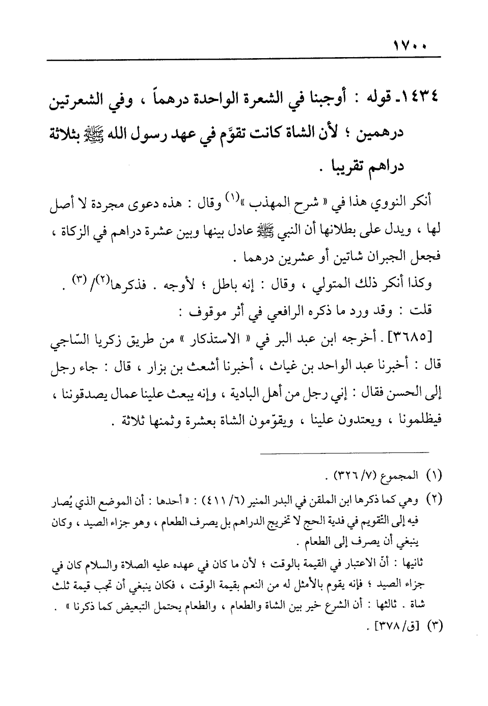 1434 - قوله: أوجبنا في الشعرة الواحدة درهمًا، وفي الشعرتين درهمين؛ لأن الشاة كانت تقوَّم في عهد رسول الله صلى الله عليه وسلم بثلاثة دراهم تقريبا.