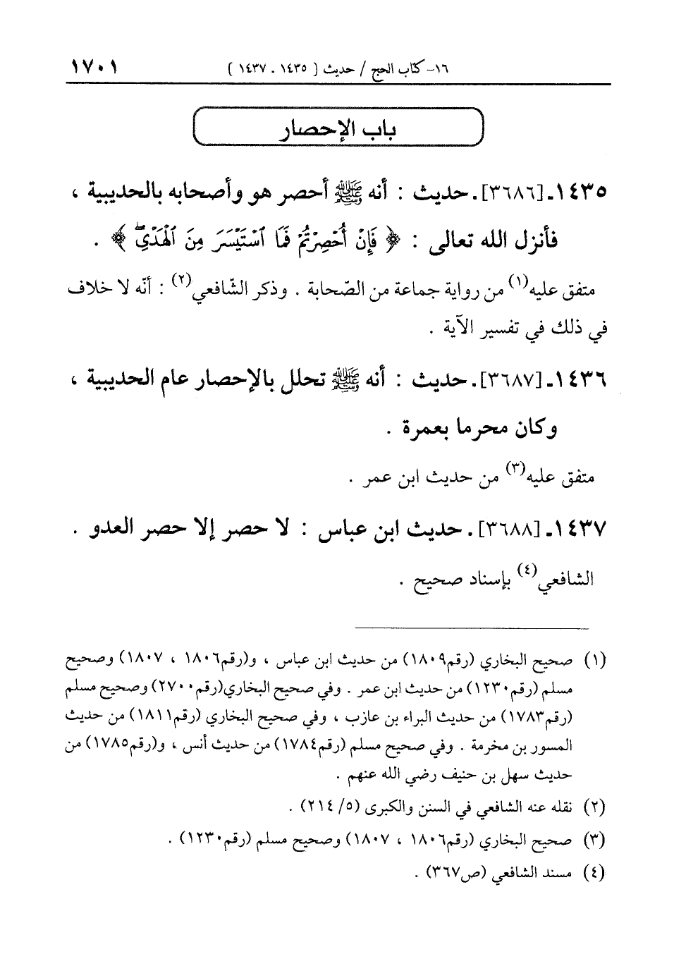 1435 - [3686]- حديث: أنه صلى الله عليه وسلم أحصر هو وأصحابه بالحديبية، فأنزل الله تعالى: {فَإِنْ أُحْصِرْتُمْ فَمَا اسْتَيْسَرَ مِنَ الْهَدْيِ}.