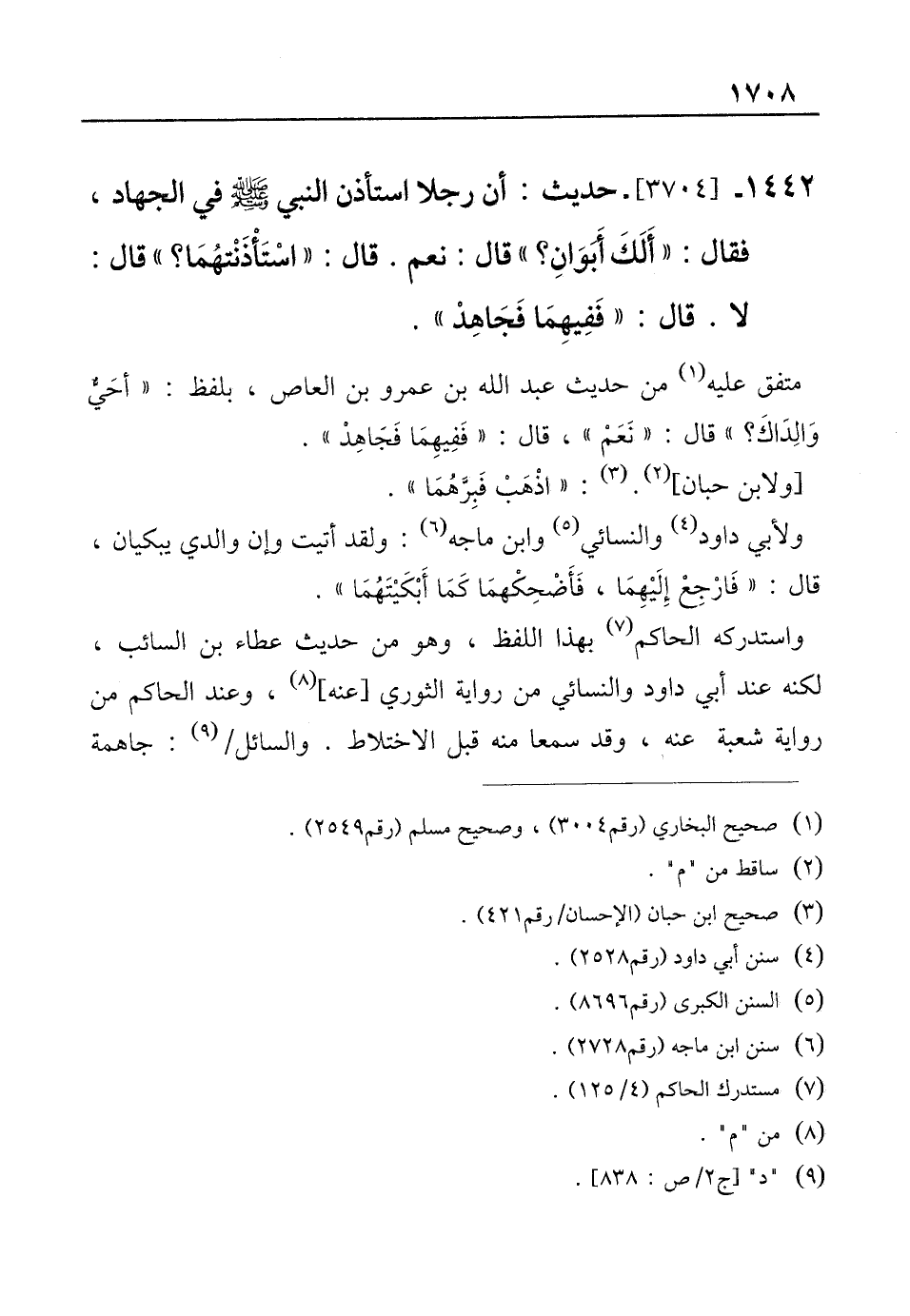 1422 - [3704]- حديث: أن رجلًا استأذن النبي صلى الله عليه وسلم في الجهاد, فقال: "أَلَكَ أَبَوَانِ؟ " قال: نعم. قال: "اسْتَأْذَنْتهُمَا؟ " قال: لا. قال: "فَفِيهِمَا فَجَاهِدْ".