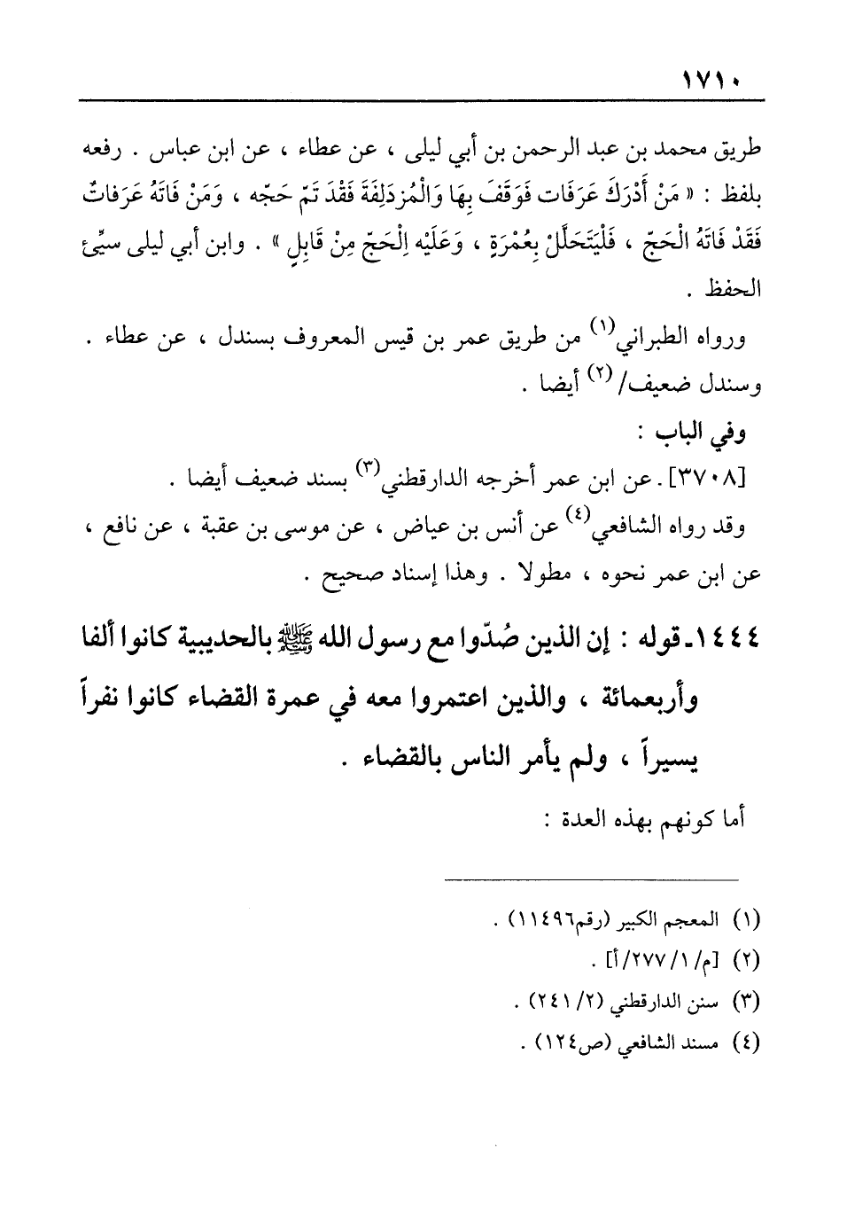 1444 - قوله: إن الذين صُدّوا مع رسول الله صلى الله عليه وسلم بالحديبية كانوا ألفا وأربعمائة، والذين اعتمروا معه في عمرة القضاء كانوا نفرًا يسيرًا، ولم يأمر الناس بالقضاء.