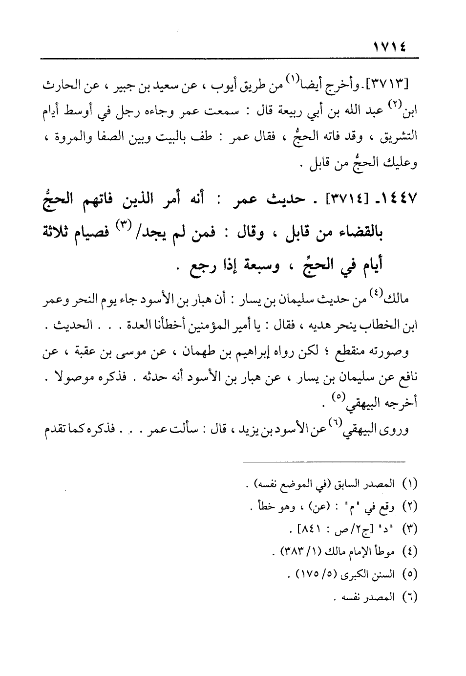 1447 - [3714]- حديث عمر: أنه أمر الذين فاتهم الحجُّ بالقضاء من قابل، وقال: فمن لم يجد (¬3) فصيام ثلاثة أيام في الحجِّ، وسبعة إذا رجع.