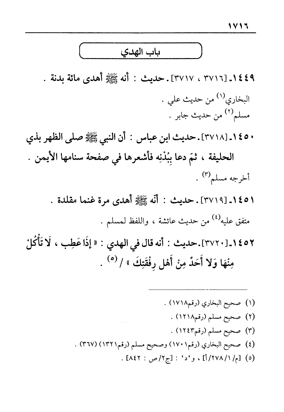 1449 - [3716 , 3717]- حديث: أنه صلى الله عليه وسلم أهدى مائة بدنة.