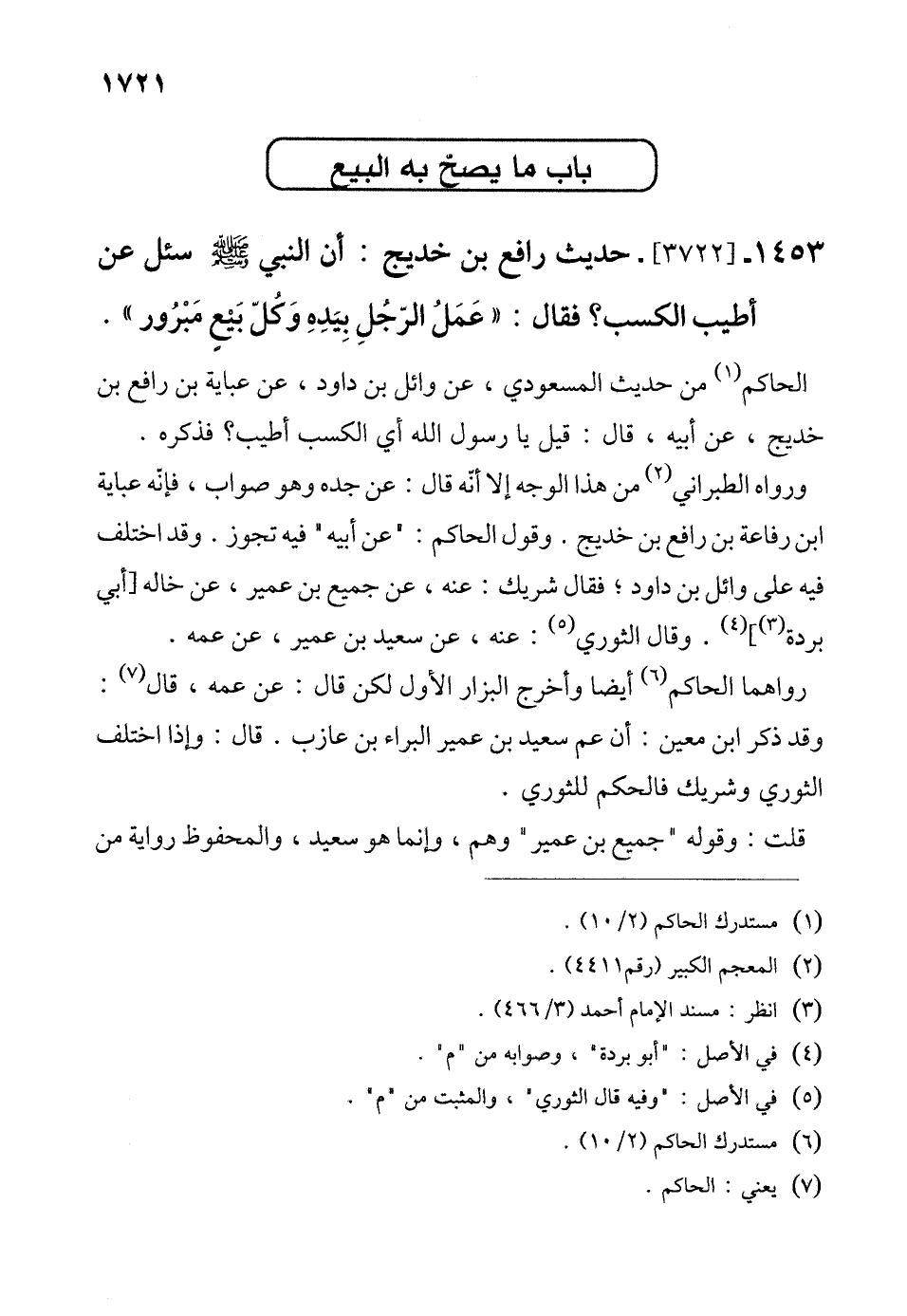 1453 - [3722]- حديث رافع بن خديج: أن النبي صلى الله عليه وسلم سئل عن أطيب الكسب؟ فقال: "عَمَلُ الرّجُل بِيدِهِ وَكُلّ بَيْعٍ مَبْرُور".