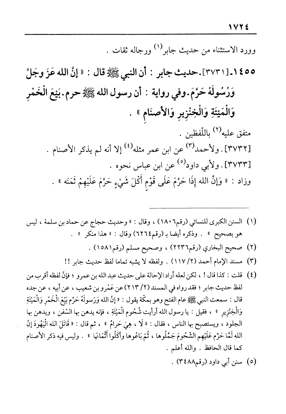 1455 - [3731]- حديث جابر: أن النبي صلى الله عليه وسلم قال: "إنَّ الله عَزَّ وجَلَّ وَرُسُولَهُ حَرَّمَ. وفي رواية: أن رسول الله صلى الله عليه وسلم حرم بَيعَ الْخَمْرِ وَالْمَيتَةِ وَالْخِنْزِيرِ وَالأصنَامِ".