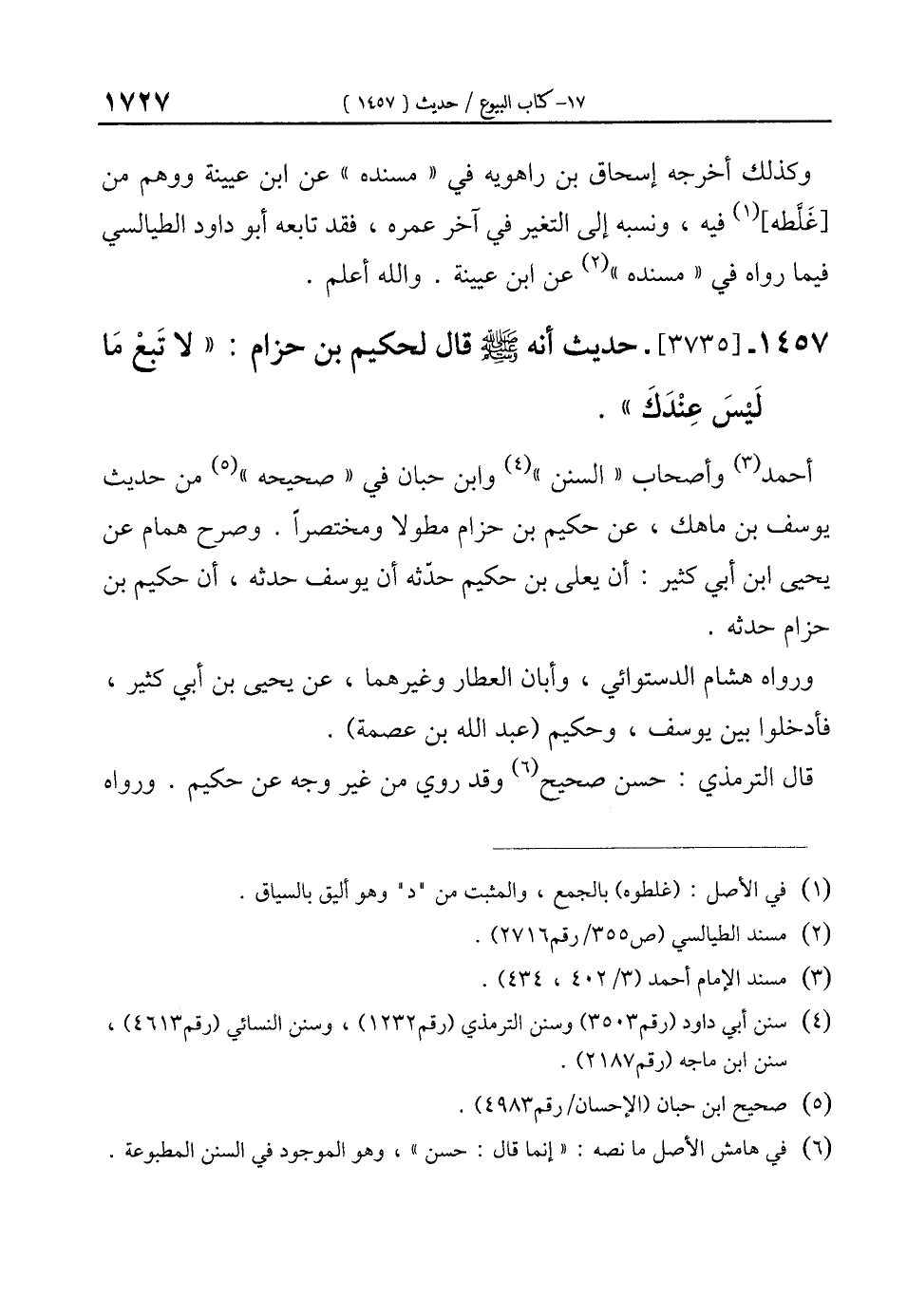 1457 - [3735]- حديث أنه صلى الله عليه وسلم قال لحكيم بن حزام: "لا تَبعْ مَا لَيسَ عِنْدَكَ".