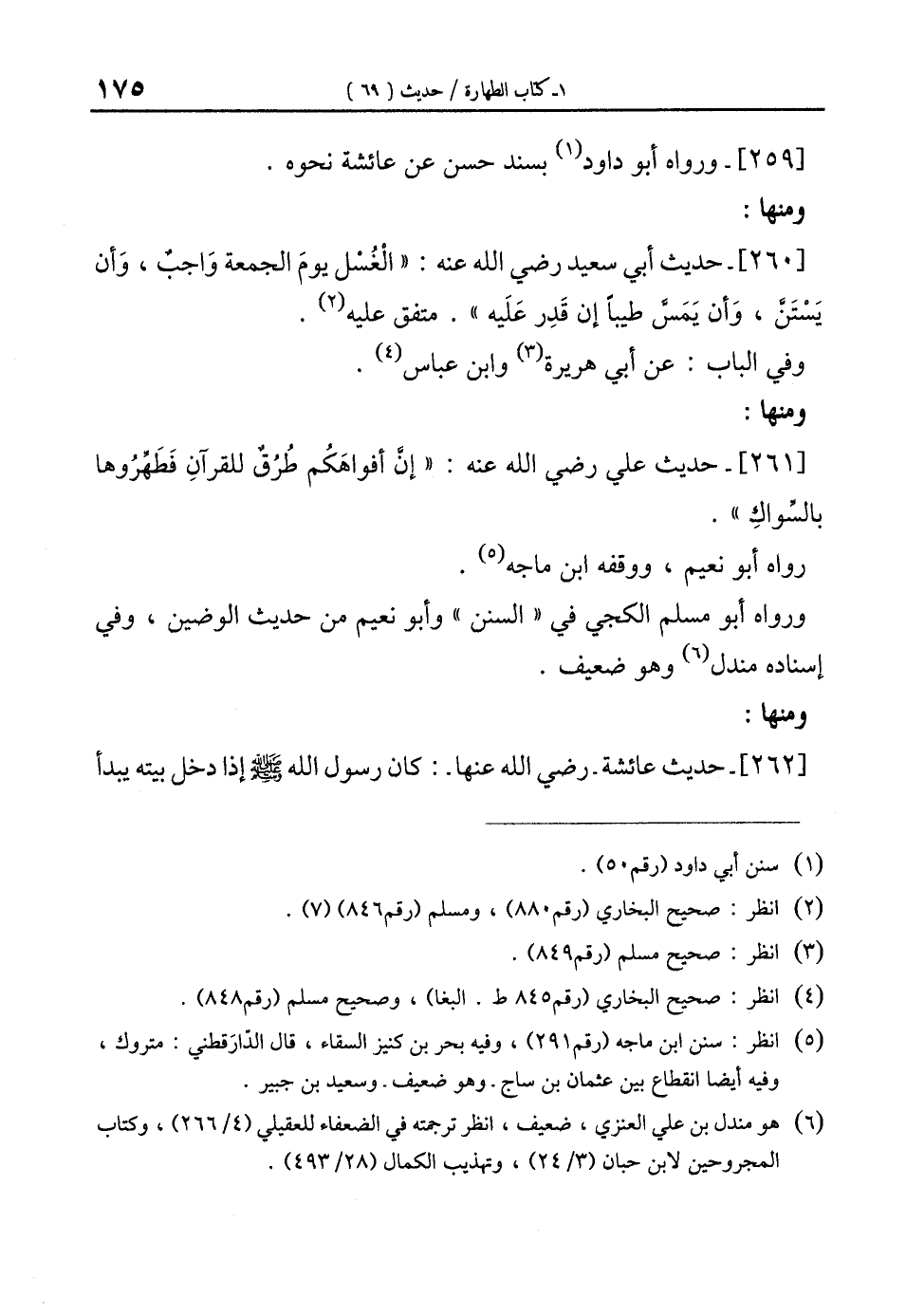[260]- حديث أبي سعيد رضي الله عنه: "الْغُسْل يومَ الجمعة وَاجبٌ، وَأن يَسْتَنَّ، وَأن يَمَسَّ طيبًا إن قَدِر عَلَيه". متفق عليه (¬2).